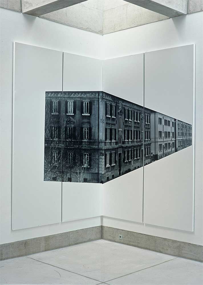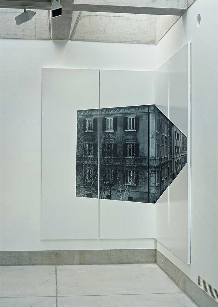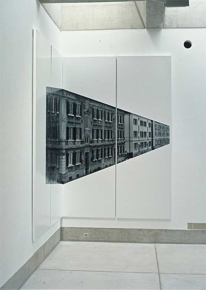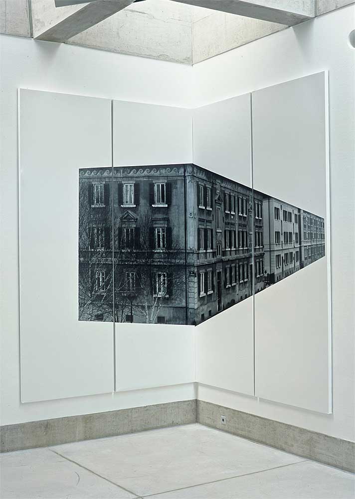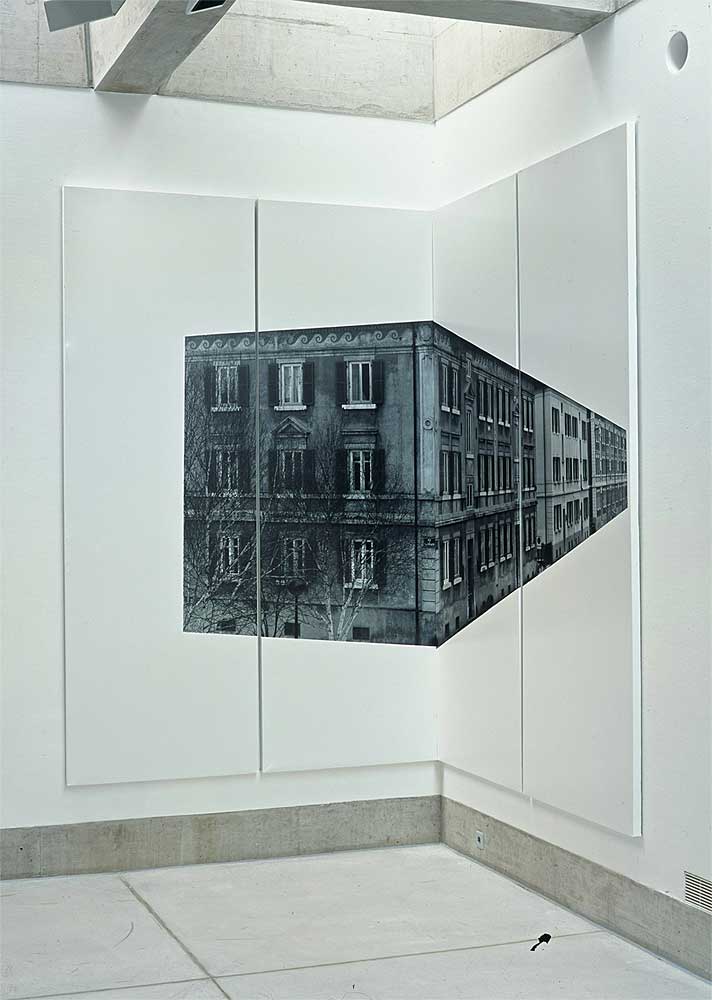 Ein quadratischer Raum, eine Wand und zwei Ecken. Fotografien von La-Chaux-de-Fonds, herausgelöst aus ihrem städtischen Kontext, lenken den Blick auf die Architektur des Ausstellungsraumes. Die Bildträger, ein System von der APG, wandfüllend und raumgreifend, sind wichtiger Bestandteil der Installation, alle gleich gross, könnten sie beliebig ergänzt werden. Bild und Raum erzeugen in der Bewegung den eigentlichen Inhalt.