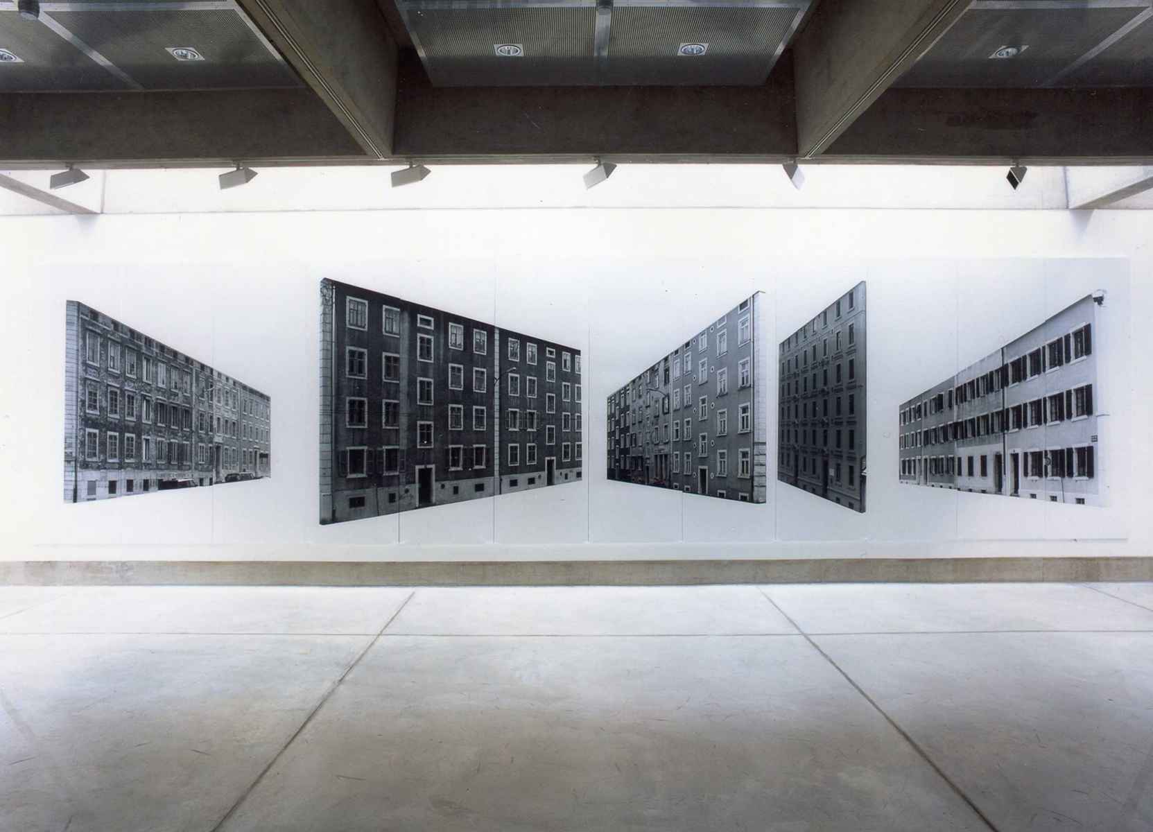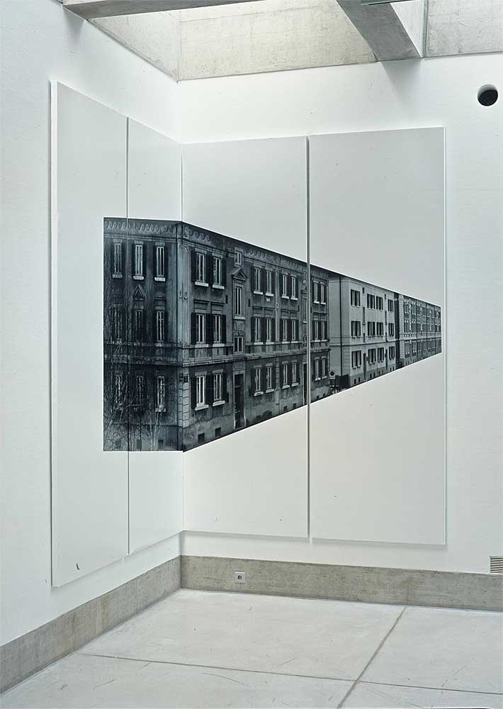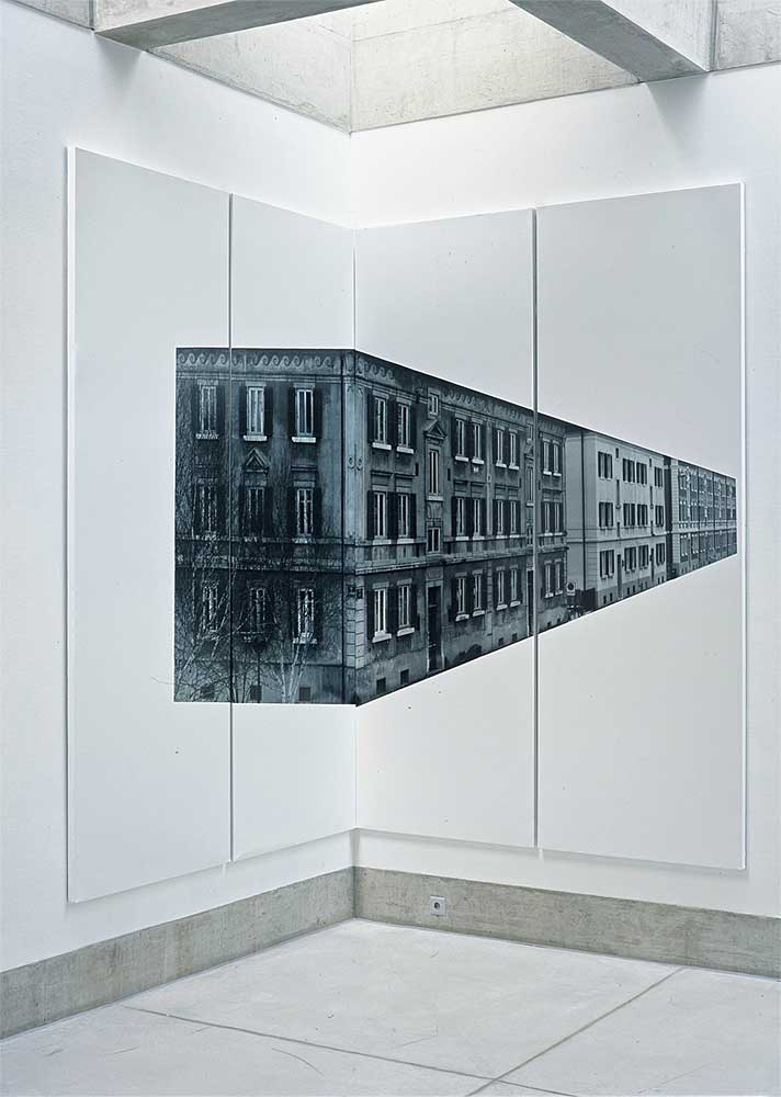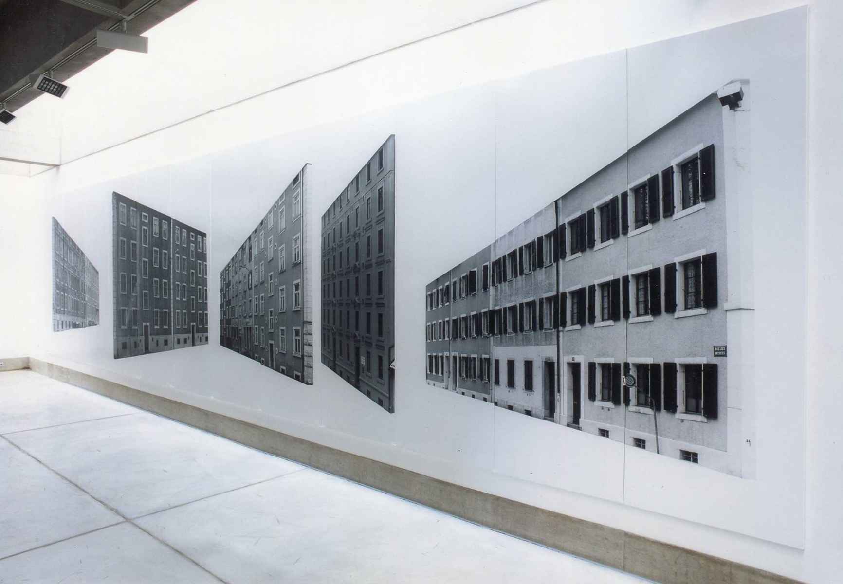 Ein quadratischer Raum, eine Wand und zwei Ecken. Fotografien von La-Chaux-de-Fonds, herausgelöst aus ihrem städtischen Kontext, lenken den Blick auf die Architektur des Ausstellungsraumes. Die Bildträger, ein System von der APG, wandfüllend und raumgreifend, sind wichtiger Bestandteil der Installation, alle gleich gross, könnten sie beliebig ergänzt werden. Bild und Raum erzeugen in der Bewegung den eigentlichen Inhalt.