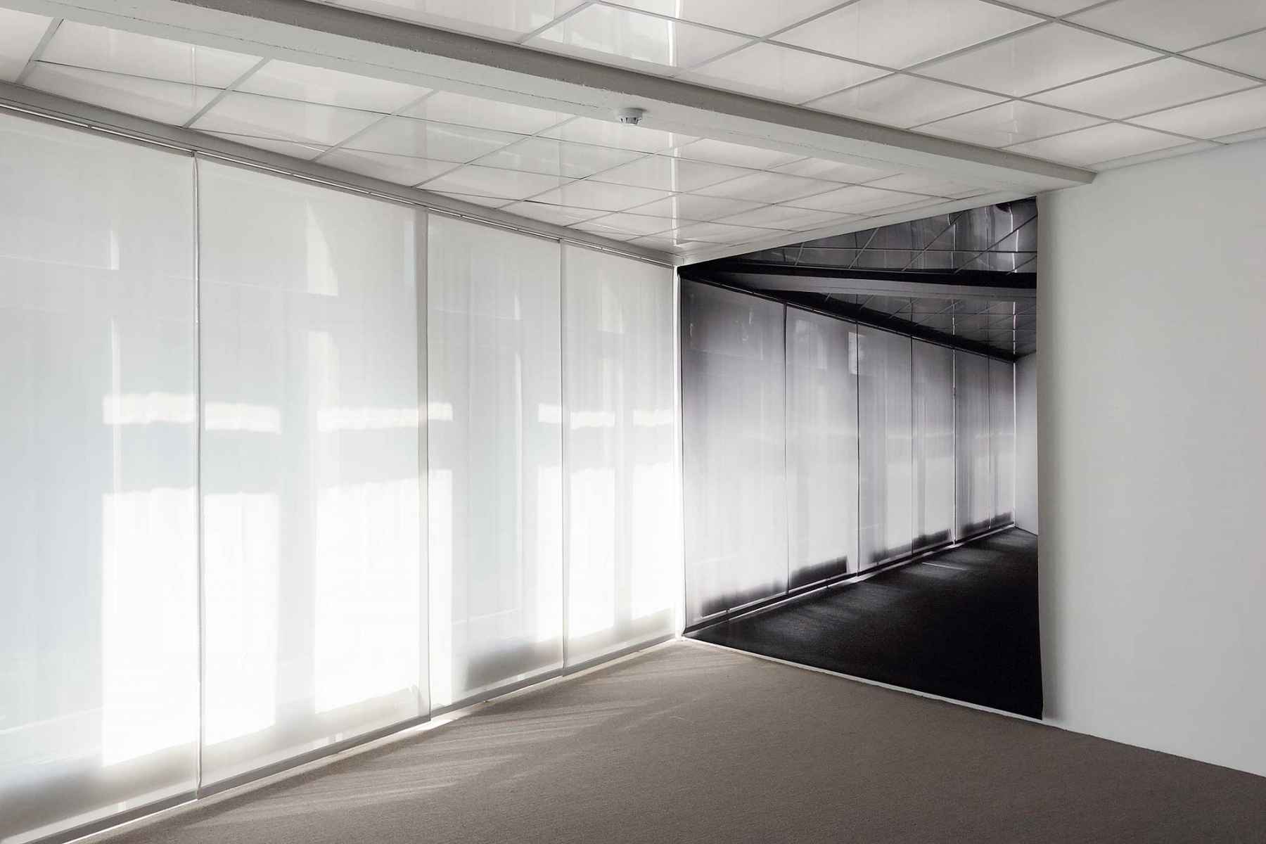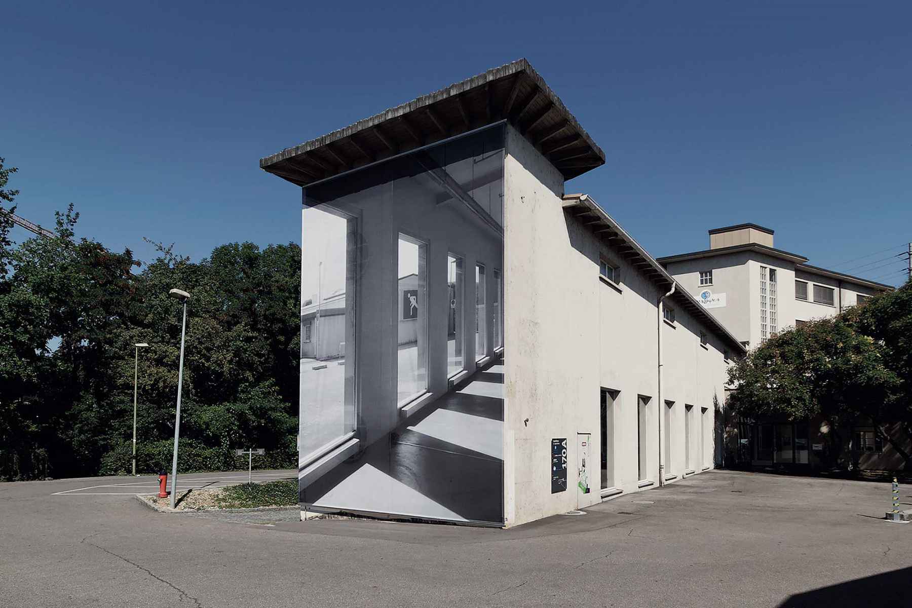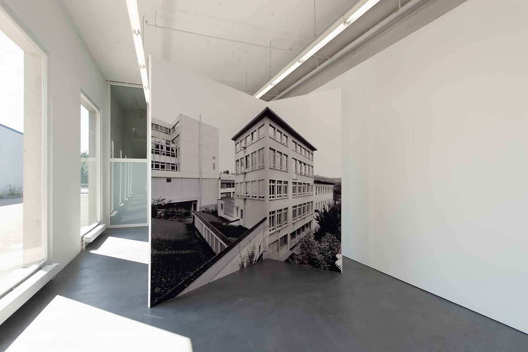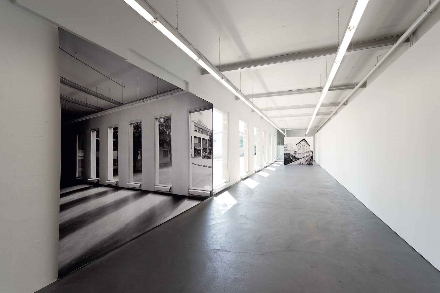 In Busers Werk unterscheiden sich verschiedene Ein- und Ansätze des Fotografischen. Mit ihren vor Ort entstandenen Fotografien macht die Künstlerin oft nicht wahrgenommene Raumbezüge, Linienführungen und baukörperliche Zusammenhänge sichtbar. Sie greift in die bestehende Architektur ein und baut mittels Fotografie ihre ureigene Version, die das Besondere des Ortes herausschält. Die Ergebnisse dieser architektonischen Bestandsaufnahmen werden in meist grossformatigen Fotografien auf Textilgewebe übertragen und an analogen Punkten der tatsächlichen Architektur eingesetzt, deren inhärente Strukturen eine völlig neue Architekturvariante zulassen. So wird die strassenseitige Fassade des Kunsthaus Baselland mit einem fotografischen Trompe l’œil des dahinter liegenden Innenraums virtuell verändert: Anstelle der bisherigen festen Mauer mit der Beschriftung des Kunsthauses zeigt sich dem Betrachter – in der Blickperspektive von innen nach aussen – die für jenen Bauteil charakteristische Fensterfront und die einfallenden Lichtstreifen. Der fotografische Eingriff bewirkt eine Oeffnung des schachtelartigen Baukörpers und leitet die BesucherInnen aufgrund der Streifenführung von Fenster- und Lichtzonen zum Haupteingang hin. Drei weitere, speziell für das Kunsthaus kreierte fotografische Architekturinterventionen streichen Vorgegebenes heraus, führen es weiter, treiben es auf die Spitze oder verschieben die reale Oertlichkeit kurzerhand um einige Meter. Der linke obere Galerieraum wird in seiner extremen Winkeldefinition mittels fotografischer „Um-die-Ecke-Führung“ hervorgehoben. Die Fensterfront im „Finger“-Raum wird quasi geknickt und um beinahe 90° umgelenkt. Eine neue lang gestreckte Raumöffnung und Fensterreihe entsteht ausgerechnet dort, wo sich einst auch real zwei weitere Fenster befanden. Den balkonartigen Galerievorsprung, welcher die Raumhöhe des Erdgeschosses zweiteilt, versetzt die Künstlerin fotografisch in eine Nische und stülpt den architektonischen Vorsprung in die entgegengesetzte Richtung. In Renate Busers Ausstellung charakterisiert sich die bisher intensivste Auseinandersetzung mit der Kunsthaus Architektur. Die Räume, deren künstlerische Handhabung immer wieder eine spezielle Herausforderung sind, werden in Busers Interventionen mit sich selbst konfrontiert.