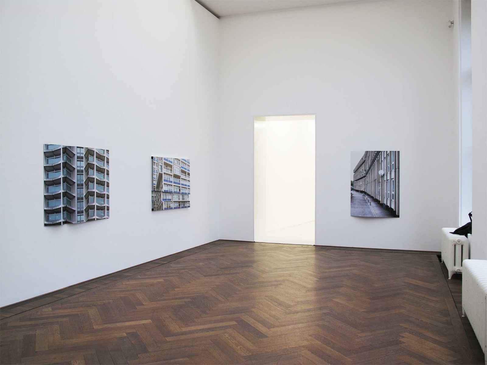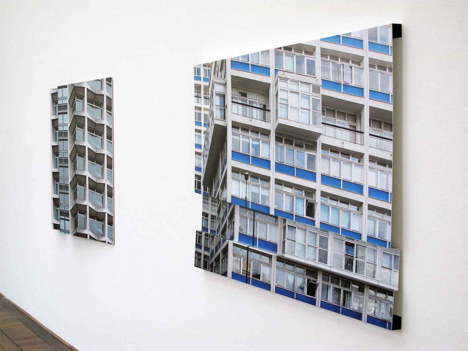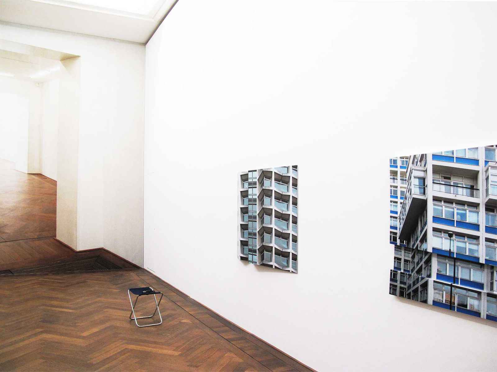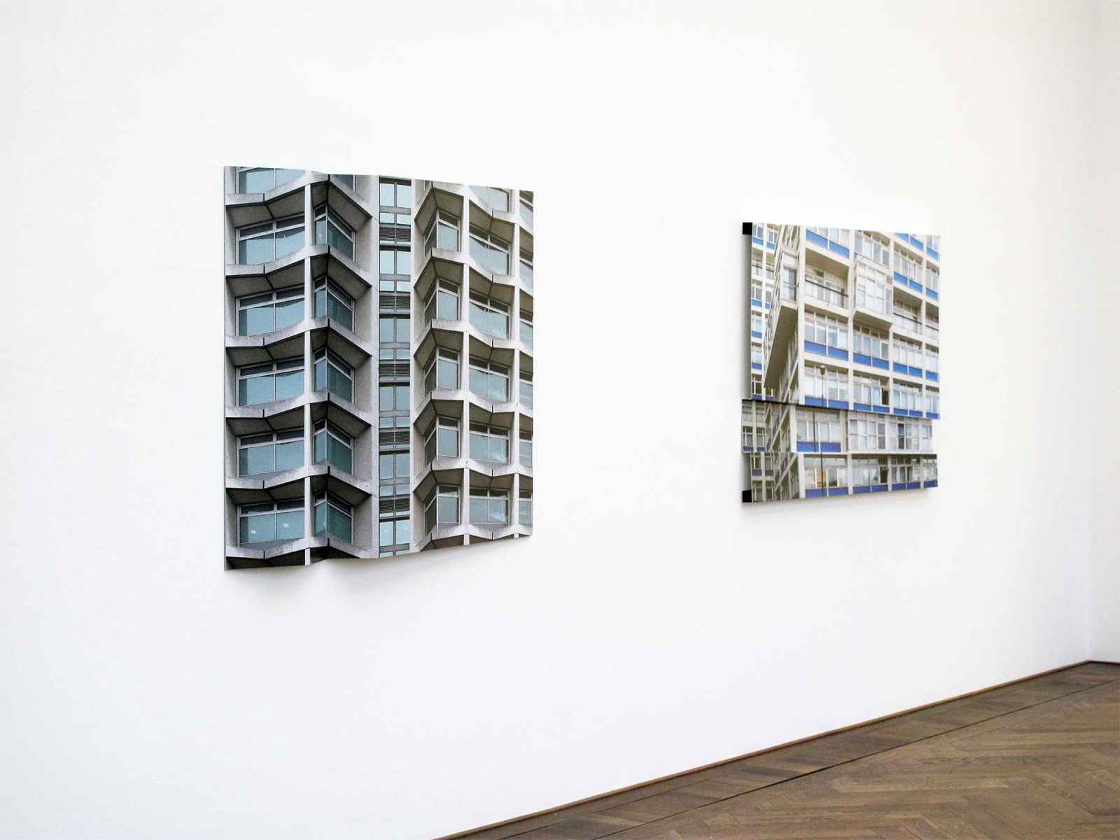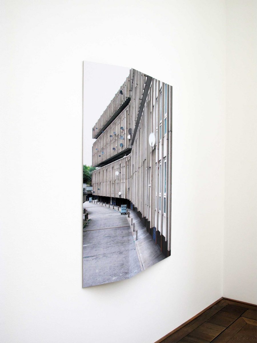 Auch Renate Buser setzt sich fotografisch mit Architektur auseinander. Sie thematisiert diese allerdings nicht nur, sie (die Architektur) ist primäres Bildthema ihrer Arbeit. Innerhalb der letzten Jahre entstanden fotografische Interventionen, Eingriffe in Architektur, genauer in bzw. an Häuserfassaden. So erweitert sie bestehende Fassaden mittels grossformatiger Fotoplots. Die Künstlerin setzt sich hier mit der Gegensätzlichkeit zwischen Innen- und Aussenraum und perspektivischen Verschiebungen und Umkehrungen innerhalb der Architekturfotografie auseinander. Auf diese Weise lässt sie oftmals kaum wahrnehmbare Raumbezüge und Linienführungen der Architekturen sichtbar werden. Ihre Arbeit Ohne Titel (2012) in der Kunsthalle Basel ist eine wandfüllende Fototapete, die eine mit einer Grossbildkamera aufgenommene Ansicht des Raumes abbildet. Es handelt sich um eine Ansicht aus gleicher Blickrichtung, aber zwei Räume weiter. Erkennbar sind die beiden Türöffnungen durch die man sich bewegt, um an die Stelle zu gelangen, an der die Fotografie entstand. Im gleichen Raum sind ausser- dem drei Fotografien Centre Point (2012), Robin Hood Gardens (2012) und Metro Central Heights (2012) zu sehen, die auf einen zum Relief gebogenen Aluminiumträger aufgezogen sind. Buser bedient sich hier der auskragenden Elemente der abgebildeten Robin Hood Gardens, eines brutalistischen Baus der 60er und 70er Jahre der englischen Architekten Alison und Peter Smithson, sowie derer des ebenfalls in brutalistischer Bauweise errichteten Hochhauses Centre Point aus dem Jahr 1967 von Richard Seifert und des mehrstöckigen Gebäudekomplexes Metro Central Heights aus den 1960er Jahren von Ernö Goldfinger und arbeitet sie im Relief zu Vertiefungen um. Spezifische Elemente von Fassaden werden betont und als Besonderheiten hervorgehoben.