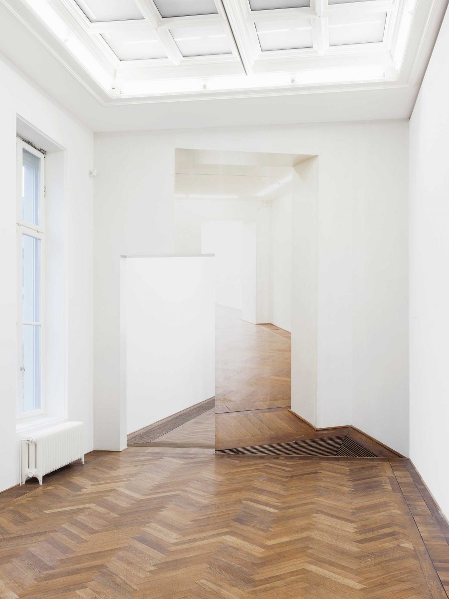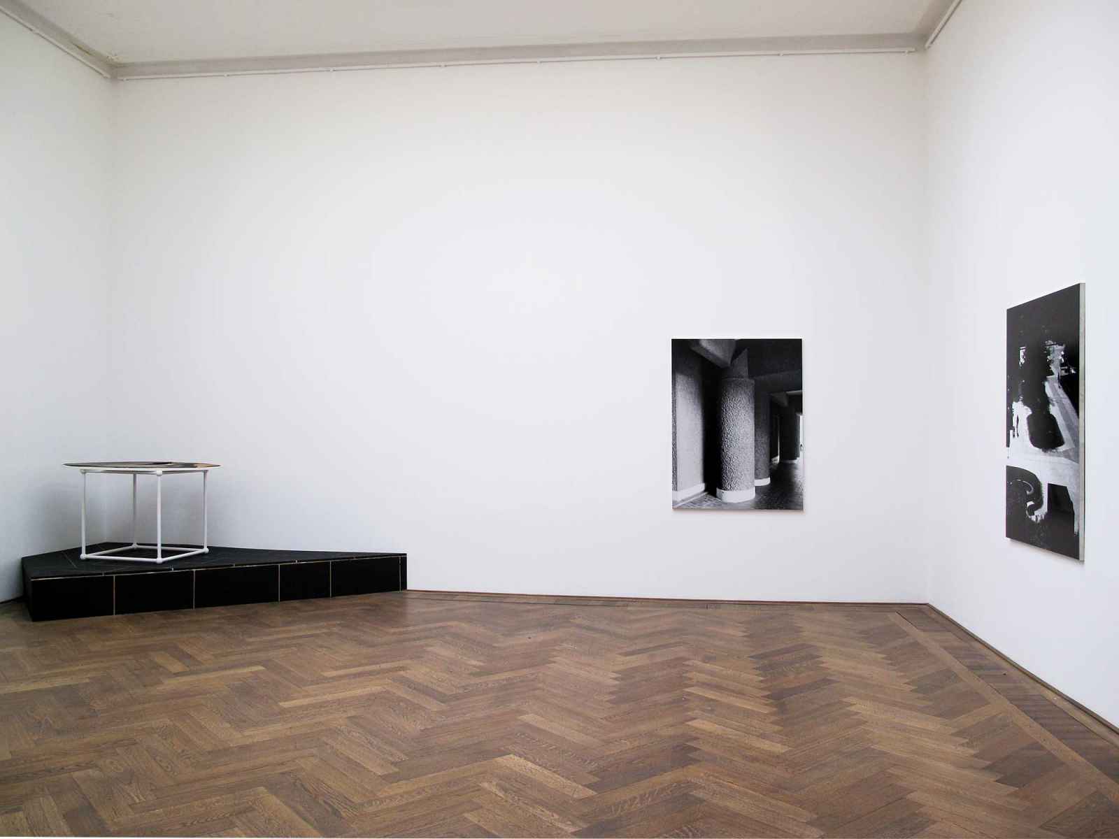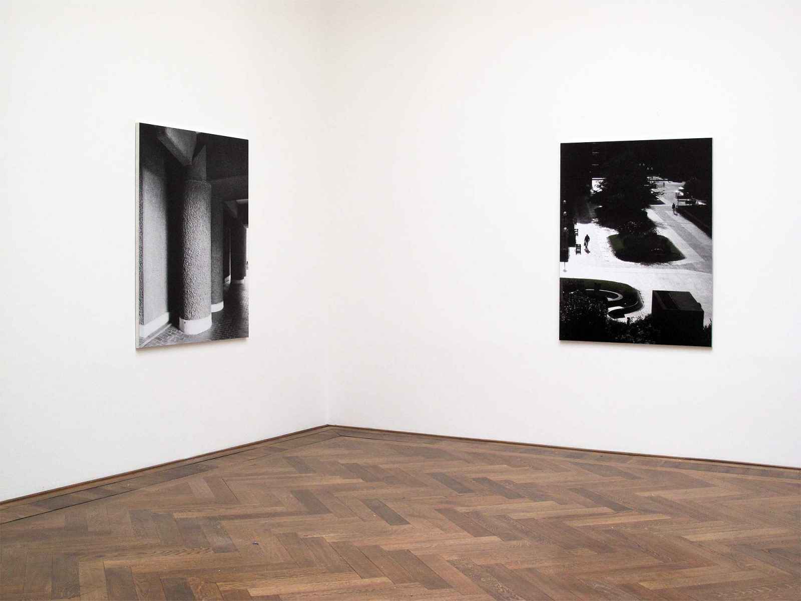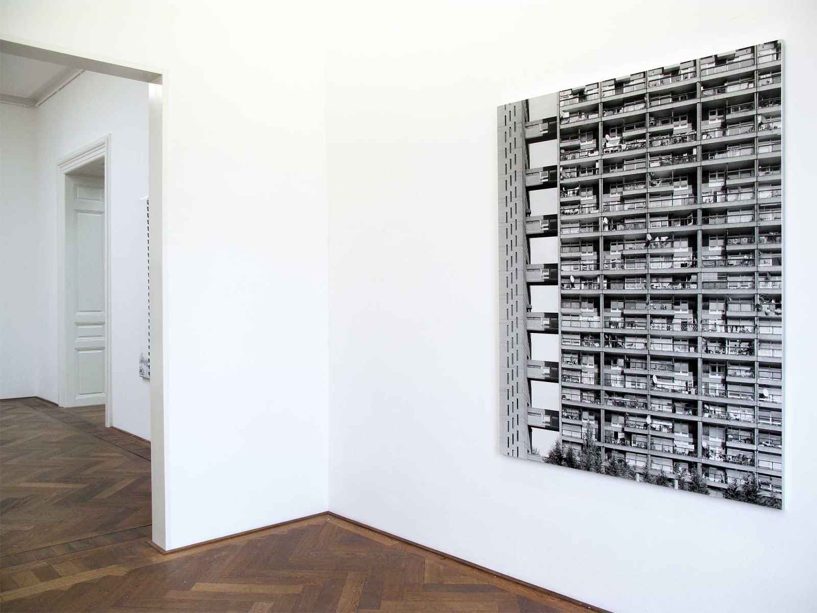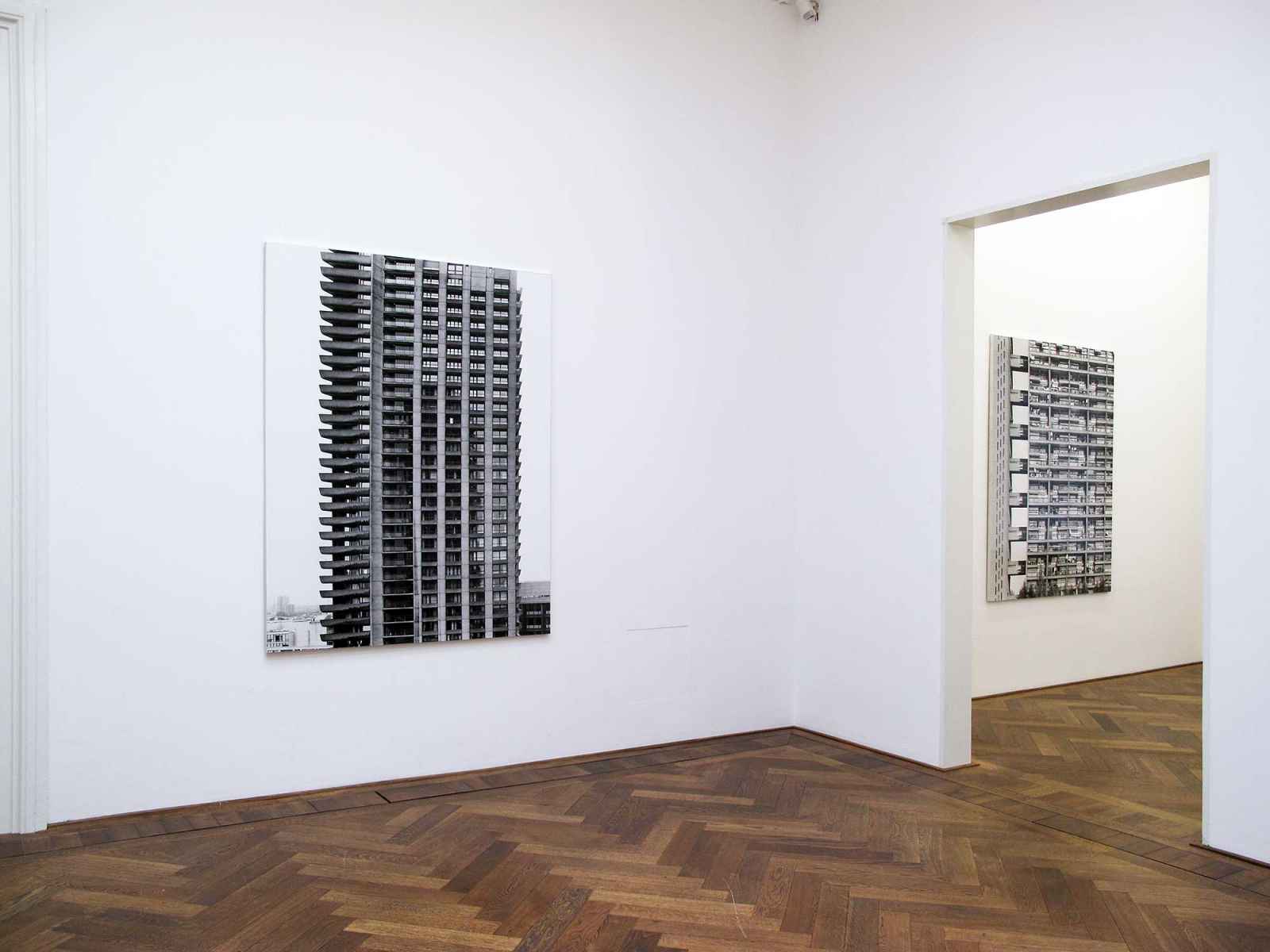 Auch Renate Buser setzt sich fotografisch mit Architektur auseinander. Sie thematisiert diese allerdings nicht nur, sie (die Architektur) ist primäres Bildthema ihrer Arbeit. Innerhalb der letzten Jahre entstanden fotografische Interventionen, Eingriffe in Architektur, genauer in bzw. an Häuserfassaden. So erweitert sie bestehende Fassaden mittels grossformatiger Fotoplots. Die Künstlerin setzt sich hier mit der Gegensätzlichkeit zwischen Innen- und Aussenraum und perspektivischen Verschiebungen und Umkehrungen innerhalb der Architekturfotografie auseinander. Auf diese Weise lässt sie oftmals kaum wahrnehmbare Raumbezüge und Linienführungen der Architekturen sichtbar werden. Ihre Arbeit Ohne Titel (2012) in der Kunsthalle Basel ist eine wandfüllende Fototapete, die eine mit einer Grossbildkamera aufgenommene Ansicht des Raumes abbildet. Es handelt sich um eine Ansicht aus gleicher Blickrichtung, aber zwei Räume weiter. Erkennbar sind die beiden Türöffnungen durch die man sich bewegt, um an die Stelle zu gelangen, an der die Fotografie entstand. Im gleichen Raum sind ausser- dem drei Fotografien Centre Point (2012), Robin Hood Gardens (2012) und Metro Central Heights (2012) zu sehen, die auf einen zum Relief gebogenen Aluminiumträger aufgezogen sind. Buser bedient sich hier der auskragenden Elemente der abgebildeten Robin Hood Gardens, eines brutalistischen Baus der 60er und 70er Jahre der englischen Architekten Alison und Peter Smithson, sowie derer des ebenfalls in brutalistischer Bauweise errichteten Hochhauses Centre Point aus dem Jahr 1967 von Richard Seifert und des mehrstöckigen Gebäudekomplexes Metro Central Heights aus den 1960er Jahren von Ernö Goldfinger und arbeitet sie im Relief zu Vertiefungen um. Spezifische Elemente von Fassaden werden betont und als Besonderheiten hervorgehoben.