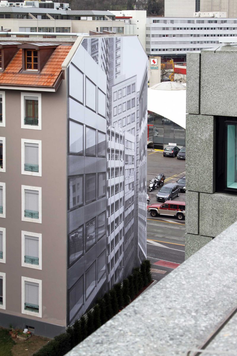 Lorsque la banque Pictet & Cie prend contact avec Renate Buser, l’artiste pense immédiatement à des vues de Tokyo pour animer la façade de l’édifice de structures architecturales montrées en perspective. Afin de rendre le trompe-l’œil réaliste et crédible tout en gardant une part d’étrangeté, l’artiste entremêle différentes vues, dont certaines sont extraites du tissu urbain le plus proche. Ainsi, une image de la façade de la banque − qui créé ainsi un prolongement fictif au bâtiment existant − et une image de l’édifice lui-même se frottent à la densité de l’architecture du quartier de Nishi-Shinjuku, au Japon, pour créer une vision de ville entre futurisme et contemporanéité, à l’instar de ce quartier en constant développement que sont les Acacias. Avec son installation, l’artiste perce le mur aveugle et ouvre la façade du bâtiment sur une cité différente et pourtant familière, dense et profonde, attirante et énigmatique, en jouant sur la juxtaposition d’espaces réels et d’espaces imaginaires. L’installation oscille dès lors entre étrangeté et proximité, authenticité et fiction, rêve et réalité, intérieur et extérieur, obscurité et clarté. Renate Buser créé une véritable utopie urbaine, entre Metropolis (Fritz Lang, 1927) et Futuropolis, elle relie la ville de demain à celle d’hier, celle du quotidien à celle de l’ailleurs. L’utilisation de la photographie noir et blanc évoque l’histoire et le souvenir d’un endroit ; il s’agit dès lors de la mémoire, même fictive et projective, du lieu, plutôt que sa réalité.