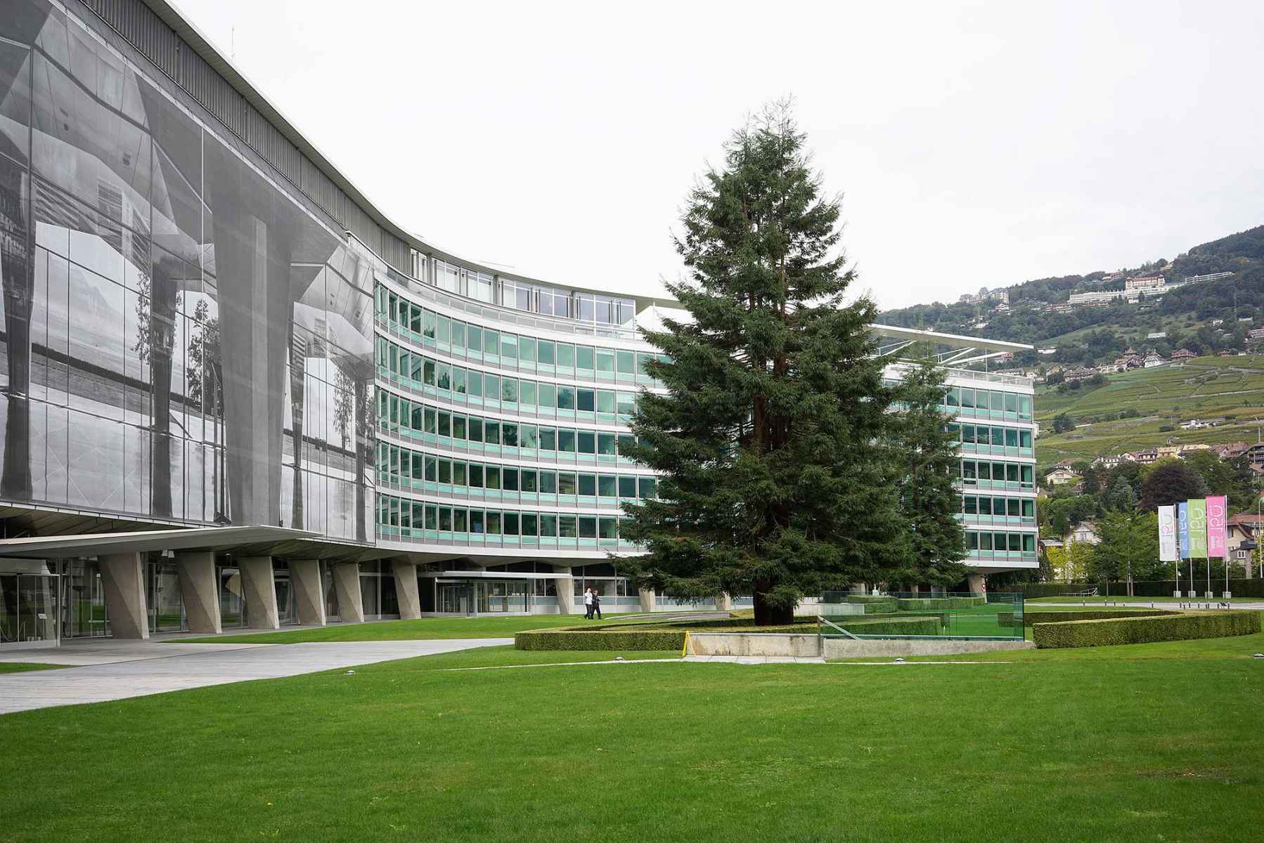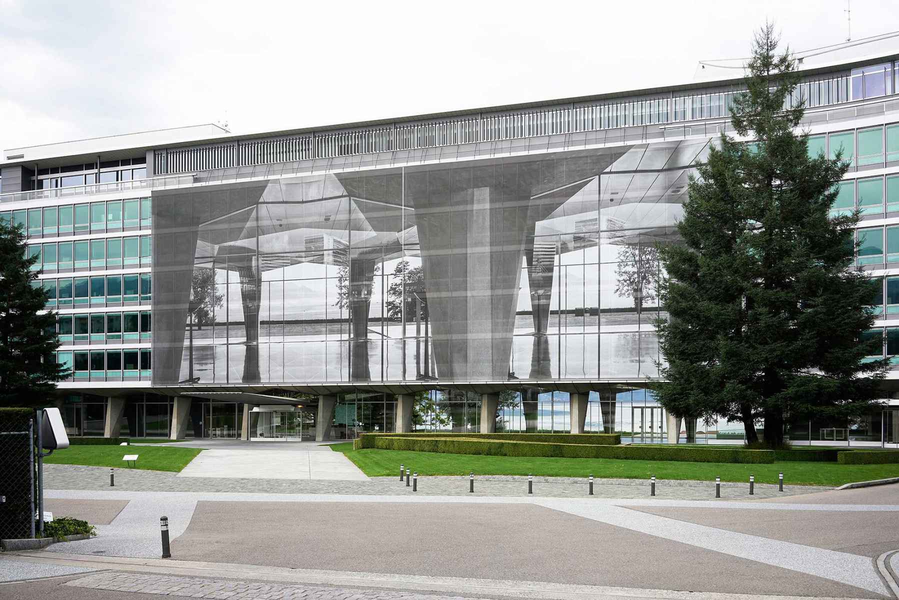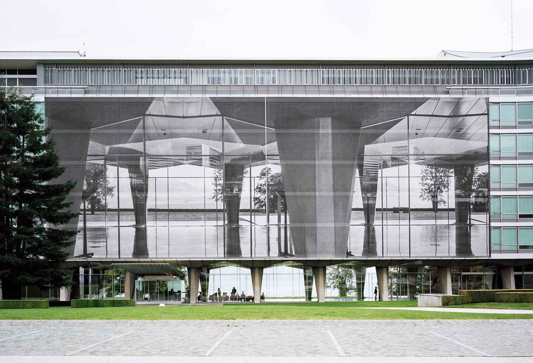 Pour sa troisième participation au Festival Images, Renate Buser investit la plus spectaculaire façade de la ville de Vevey en présentant sa pièce Avenue Nestlé 55 sur le bâtiment du siège international de Nestlé. Comme à son habitude, l’artiste travaille autour d’une construction emblématique du patrimoine architectural pour créer une installation monumentale, placée de manière à questionner notre rapport à la réalité. Pour cette nouvelle réalisation, elle capte l’essence de ce fleuron de l’architecture contemporaine en photographiant le hall d’entrée du siège de la multinationale, pour ensuite l’agrandir sur la façade nord du bâtiment. Ouverture, transparence et pureté esthétique : les principes directeurs de l’ouvrage conçu par l’architecte lausannois Jean Tschumi apparaissent alors de façon grandiose aux yeux des passants et des automobilistes. Entre mise en abyme et gigantesque trompe-l’oeil, l’installation nous invite à plonger le regard au travers du bâtiment, alors qu’architectures reproduite et réelle se confondent.