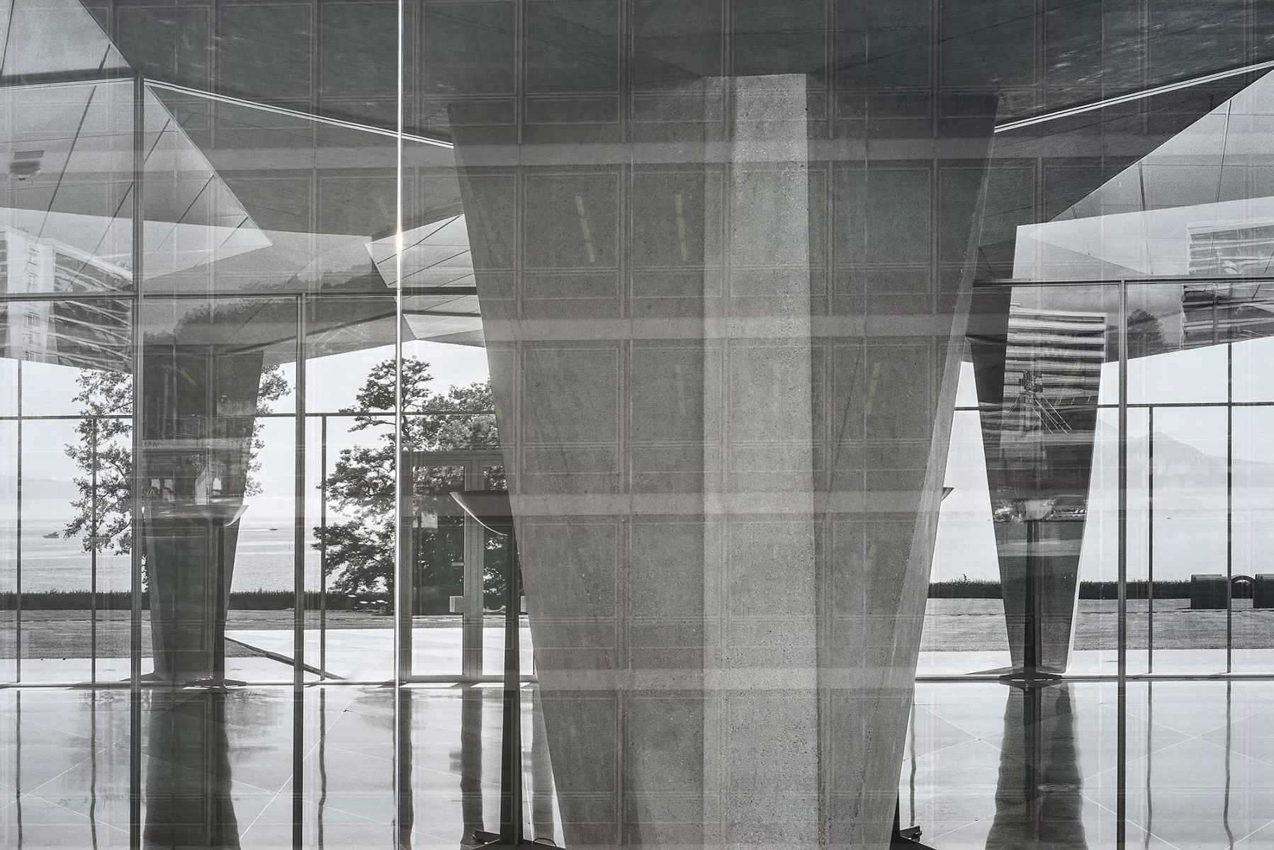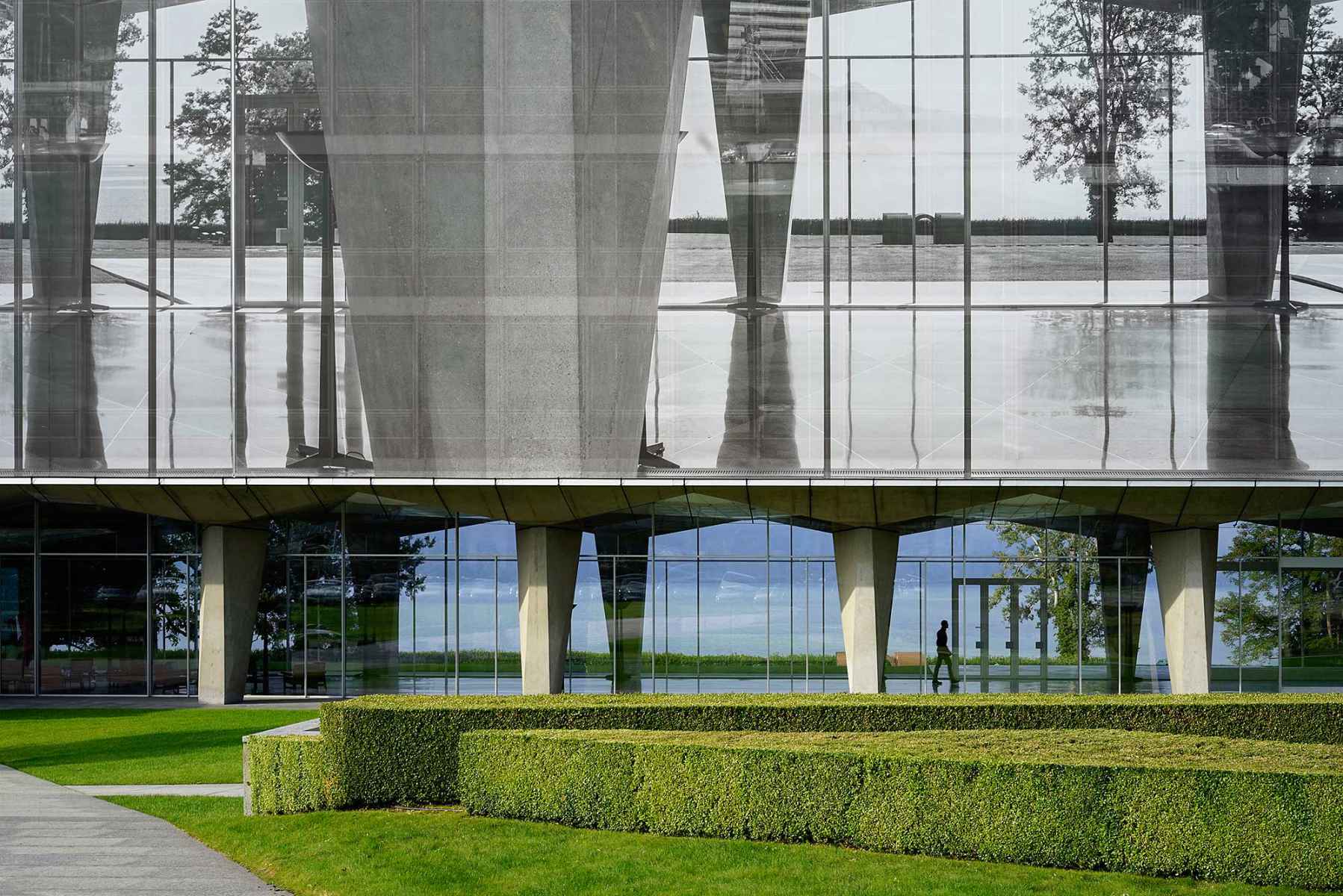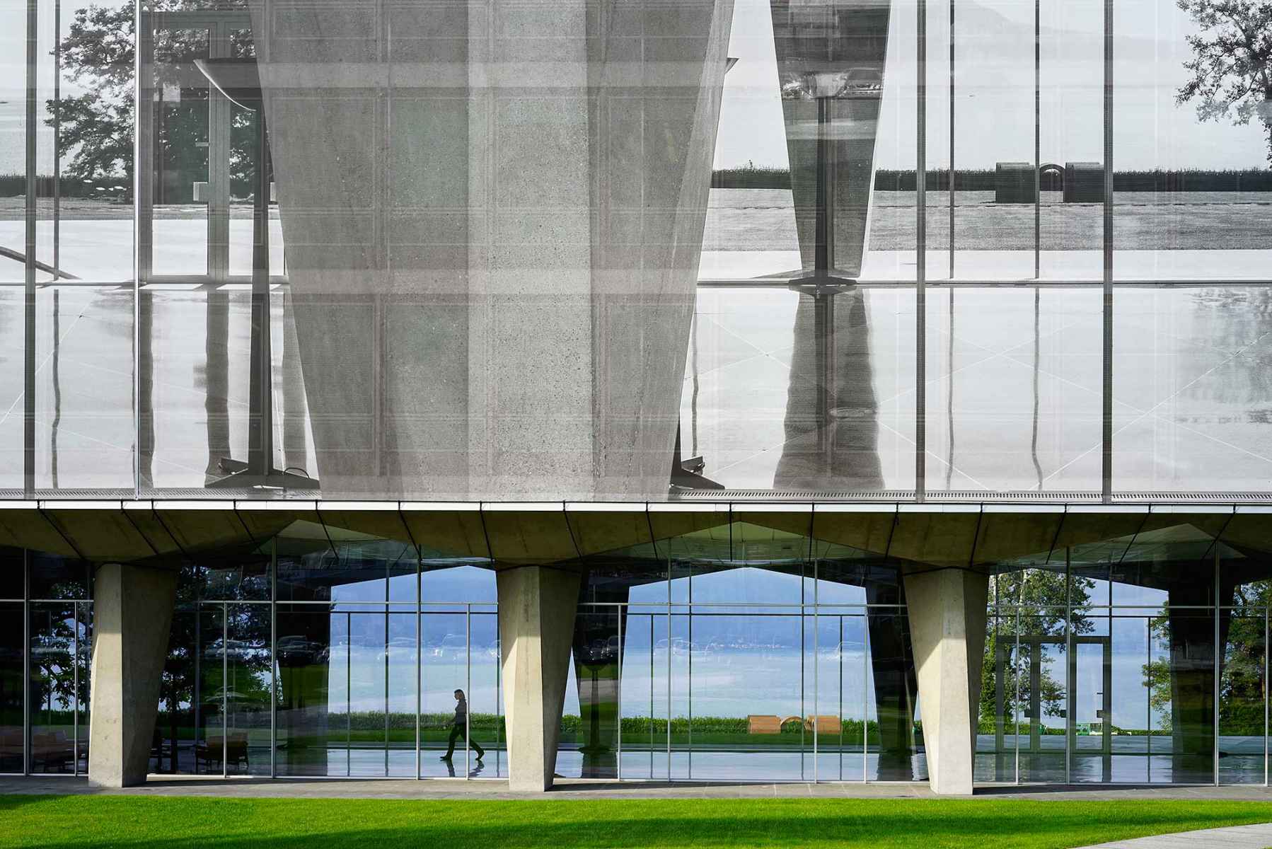 Pour sa troisième participation au Festival Images, Renate Buser investit la plus spectaculaire façade de la ville de Vevey en présentant sa pièce Avenue Nestlé 55 sur le bâtiment du siège international de Nestlé. Comme à son habitude, l’artiste travaille autour d’une construction emblématique du patrimoine architectural pour créer une installation monumentale, placée de manière à questionner notre rapport à la réalité. Pour cette nouvelle réalisation, elle capte l’essence de ce fleuron de l’architecture contemporaine en photographiant le hall d’entrée du siège de la multinationale, pour ensuite l’agrandir sur la façade nord du bâtiment. Ouverture, transparence et pureté esthétique : les principes directeurs de l’ouvrage conçu par l’architecte lausannois Jean Tschumi apparaissent alors de façon grandiose aux yeux des passants et des automobilistes. Entre mise en abyme et gigantesque trompe-l’oeil, l’installation nous invite à plonger le regard au travers du bâtiment, alors qu’architectures reproduite et réelle se confondent.