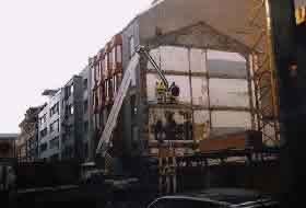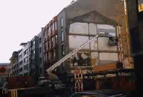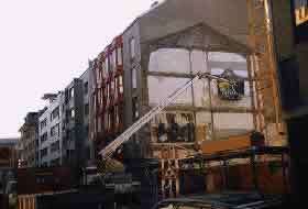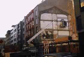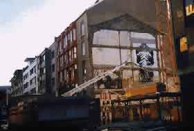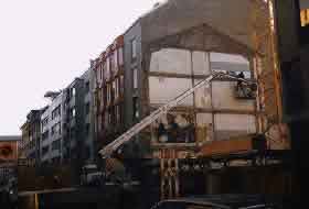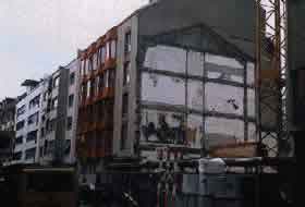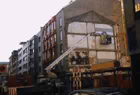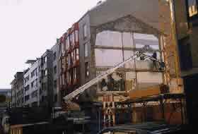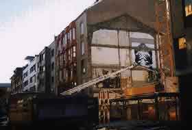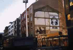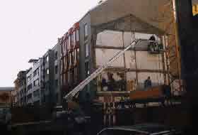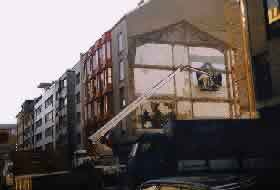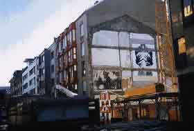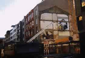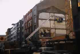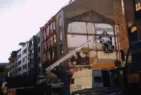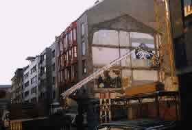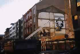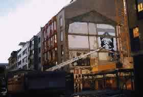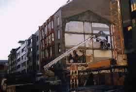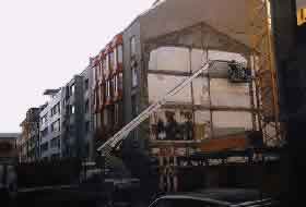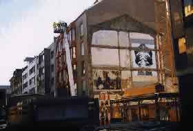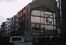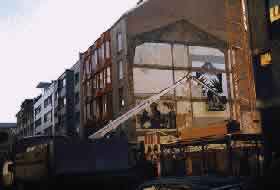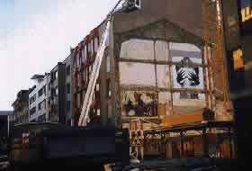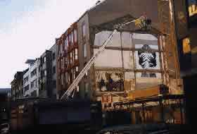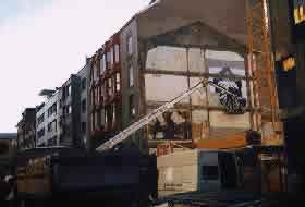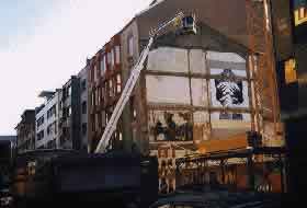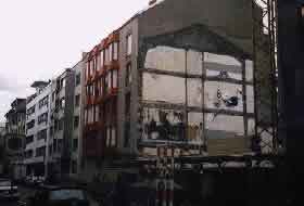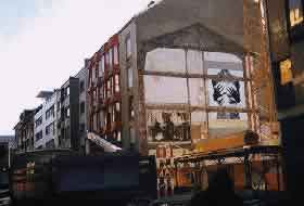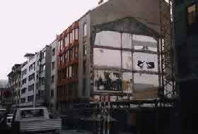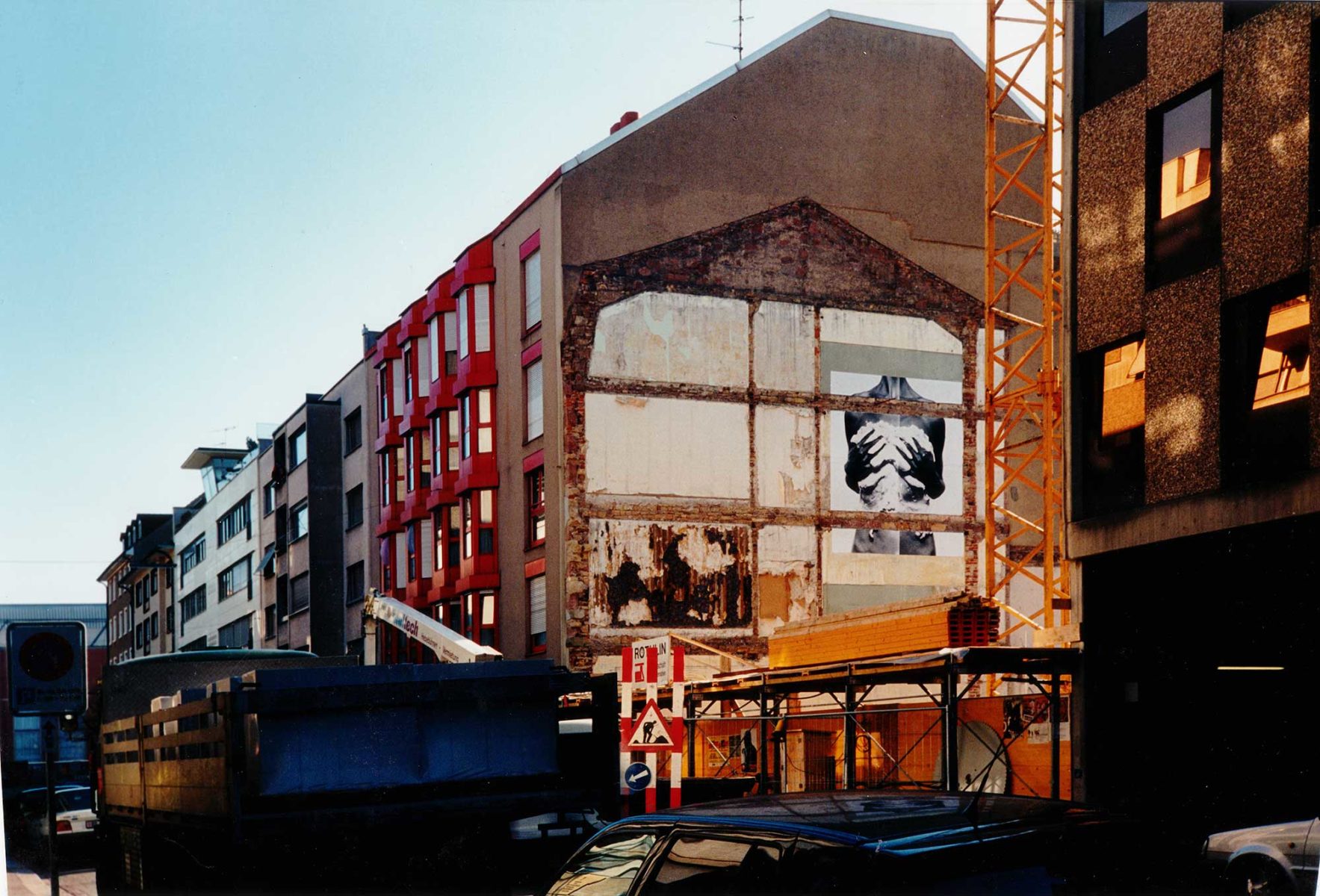 Die Unterteilung der Wohnungen und die verschiedenen Stockwerke sind auf der Wand noch sichtbar. Die Wände mit den teilweise noch vorhandenen Tapeten sind gleichzeitig Innen- und Aussenraum. Auch der Übergang von Privatraum (Wände mit Tapeten) zu halböffent-lichem Raum (Treppenhaus) ist anhand der verschiedenen Wand-strukturen noch gut erkennbar. In dieser Fassade steckt ein hohes Erinnerungspotential, das mit dem Plakatieren einzelner Wandflächen aktiviert werden soll. Das Bild thematisiert Intimität und Körperlichkeit und soll auf den freigelegten Innenräumen wie ein Werbeplakat im Aussenraum als universelles Verständigungs-mittel funktionieren. Das Bild soll sich über mehrere Stockwerke erstrecken und so das Raster des Mauerwerks durchbrechen. Das Bild wirkt fremd auf der Fassade und ist gleichzeitig architektonischer Bestandteil. Es wird über Wochen und Monate eine eigene Geschichtlichkeit entwickeln, die sich mit der Geschichte des ehemaligen Gebäudes verbinden wird. Die Geschichte der Fassade wird überlagert von der Geschichtsträchtigkeit der Gegenwart, in diesem Falle die mögliche Veränderung des Bildes.