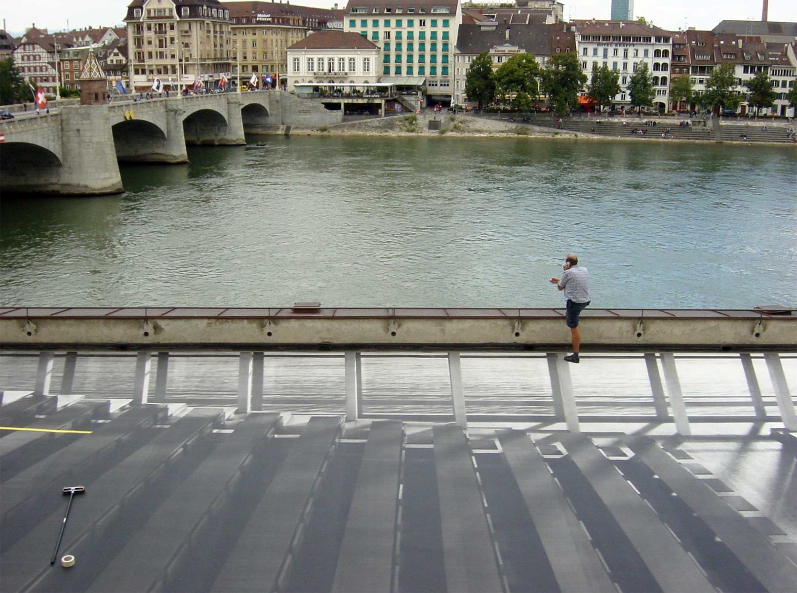 Vom Rheinsprung hat man einen erhöhten Blick auf die Terrasse. Darunter befindet sich ein Hörsaal der Universität Basel. Es wird im Massstab 1:20 ein Modell des Hörsaales gebaut und schwarz-weiss fotografiert. Diese Fotografie wird im Massstab 1:1 auf den Terrassenboden appliziert, um das «Darunter» sichtbar zu machen.