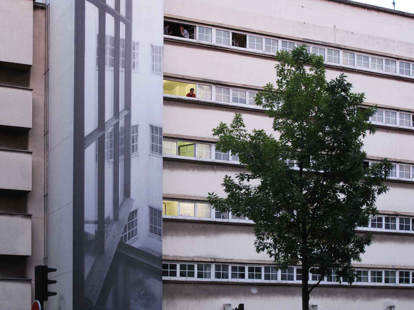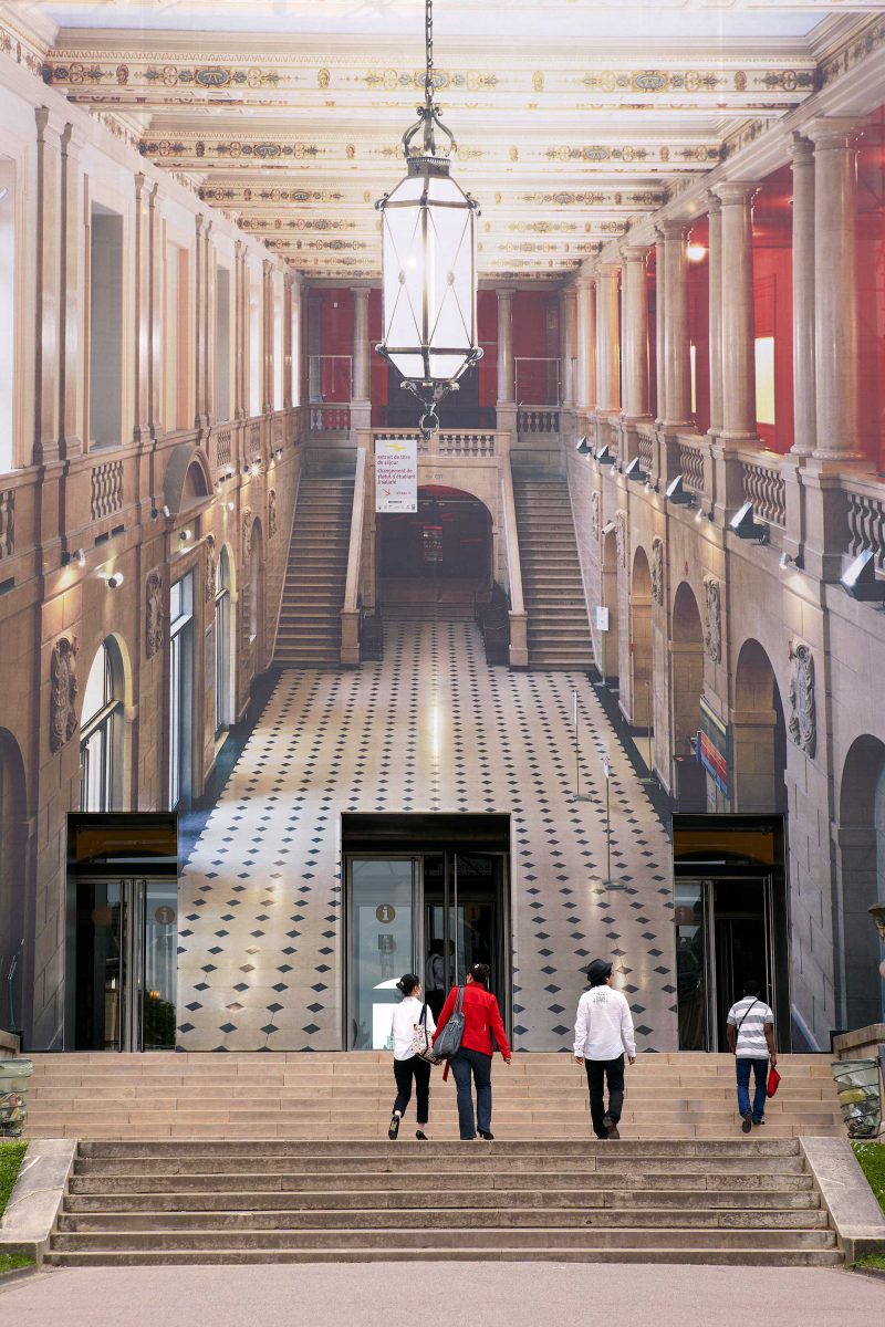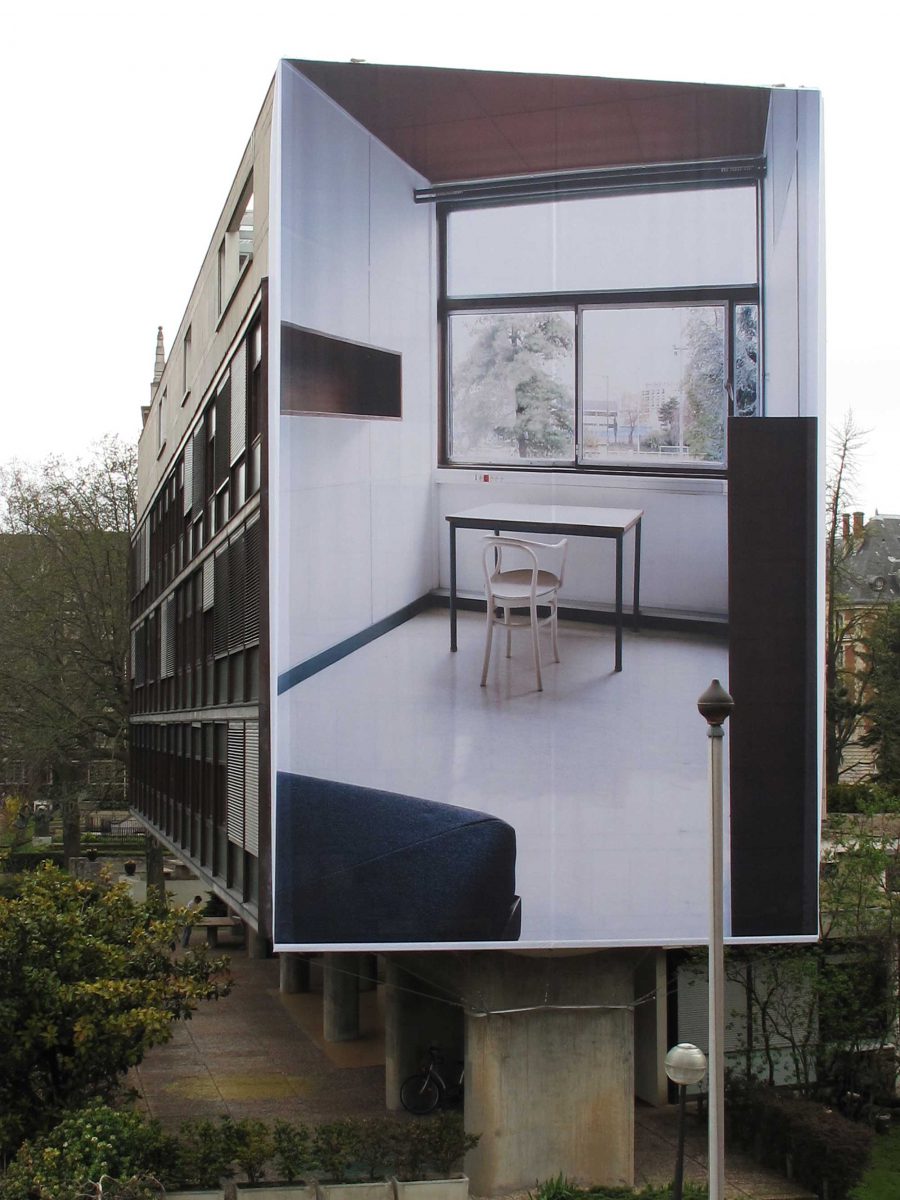 L’artiste a identifié plusieurs bâtiments emblématiques et a défini quatre installations photographiques monumentales sur le même principe récurrent : une photographie monumentale posée sur la façade d’un bâtiment qui donne ainsi l’illusion d’ouvrir le bâtiment à l’aide de procédés photographiques, de jeux de lumière et de perspective. Renate Buser considère la façade comme une interface entre intérieur et extérieur du bâtiment. Le sujet représenté, une chambre ou un espace commun, est traité comme un motif développé à grande échelle, renforçant ainsi le focus désiré.