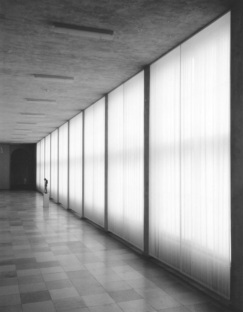Bei den Schwarz-Weiss Fotografien handelt es sich um perspektivische Ansichten der Vorhallen mit den Vorhängen im 1. Stock. Diese Vorhänge sind wie halbtransparente lichtdurchlässige weisse Wände. Sie haben in den Verbindungsgängen zu den Ausstellungsräumen visuell sehr grosse Präsenz. Je nach Wetter und Tageszeit vermitteln sie eine andere Atmosphäre im Raum.