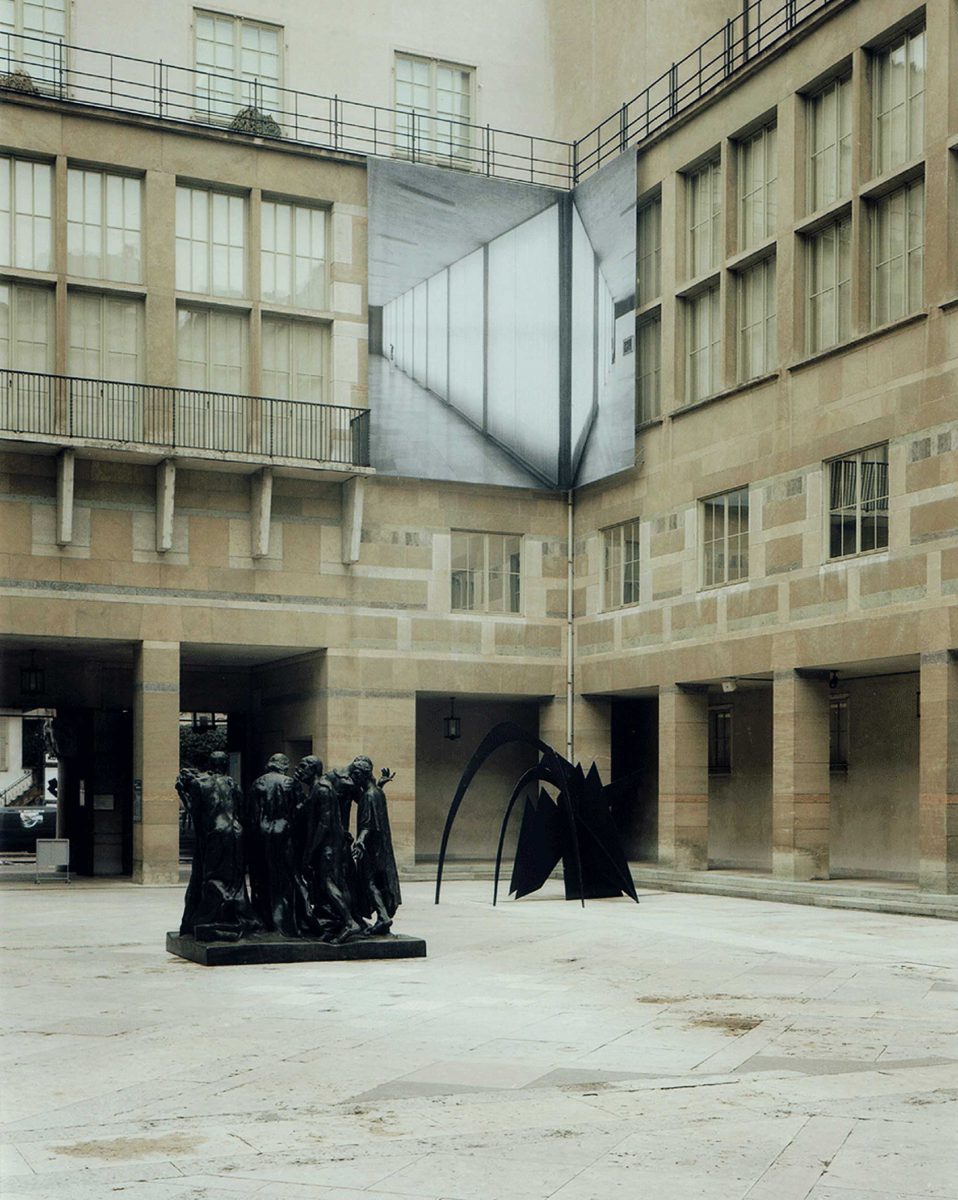 An der Ecke des Gebäudes schneidet eine perspektivische Ansicht ein Loch in die Fassade. Eine Wand kippt nach innen, öffnet den Blick ins Innere. Die eher geschlossen wirkende Fassade wird mit einer Fotografie räumlich durchbrochen. Der zweite Teil der Installation befindet sich auf der dahinter liegenden Ecke im Innenhof. Dort wird die Ecke mit einer fotografischen Ansicht einer Übereck-perspektive des Ganges, der sich räumlich gleich dahinter befindet, überlagert.