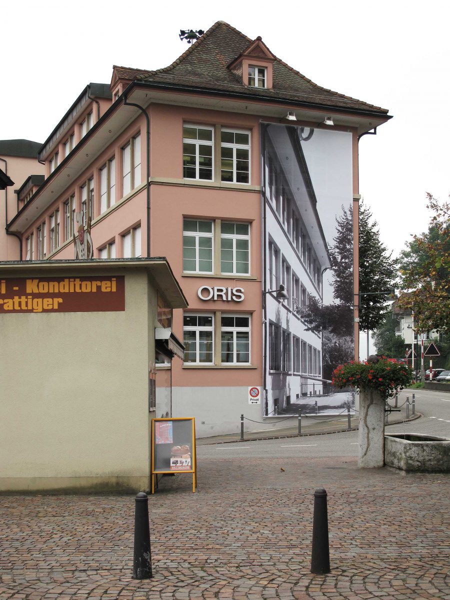 Das Gebäude der Uhrenfabrikation ORIS liegt an einem verkehrstechnisch spannenden Ort: Kreuzung, Barriere, Bahnhof, aber auch die sehr gut frequentierte Bäckerei gleich gegenüber des Firmenstandorts veranlassen Autofahrer und Zugpendler zu einem kurzen Zwischenhalt. Die Fassade ist normalerweise eine Fläche für Uhrenwerbung. Den gewohnten Anblick zu durchbrechen, eine Irritation zu schaffen mit etwas komplett und im wörtlichen Sinn Alltäglichem, nämlich der Architektur, die man täglich zur Kenntnis nimmt, das finde ich spannend.»