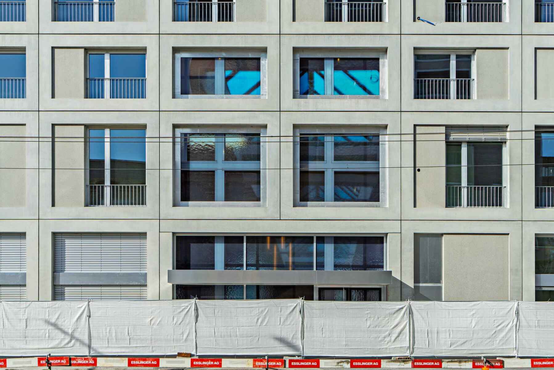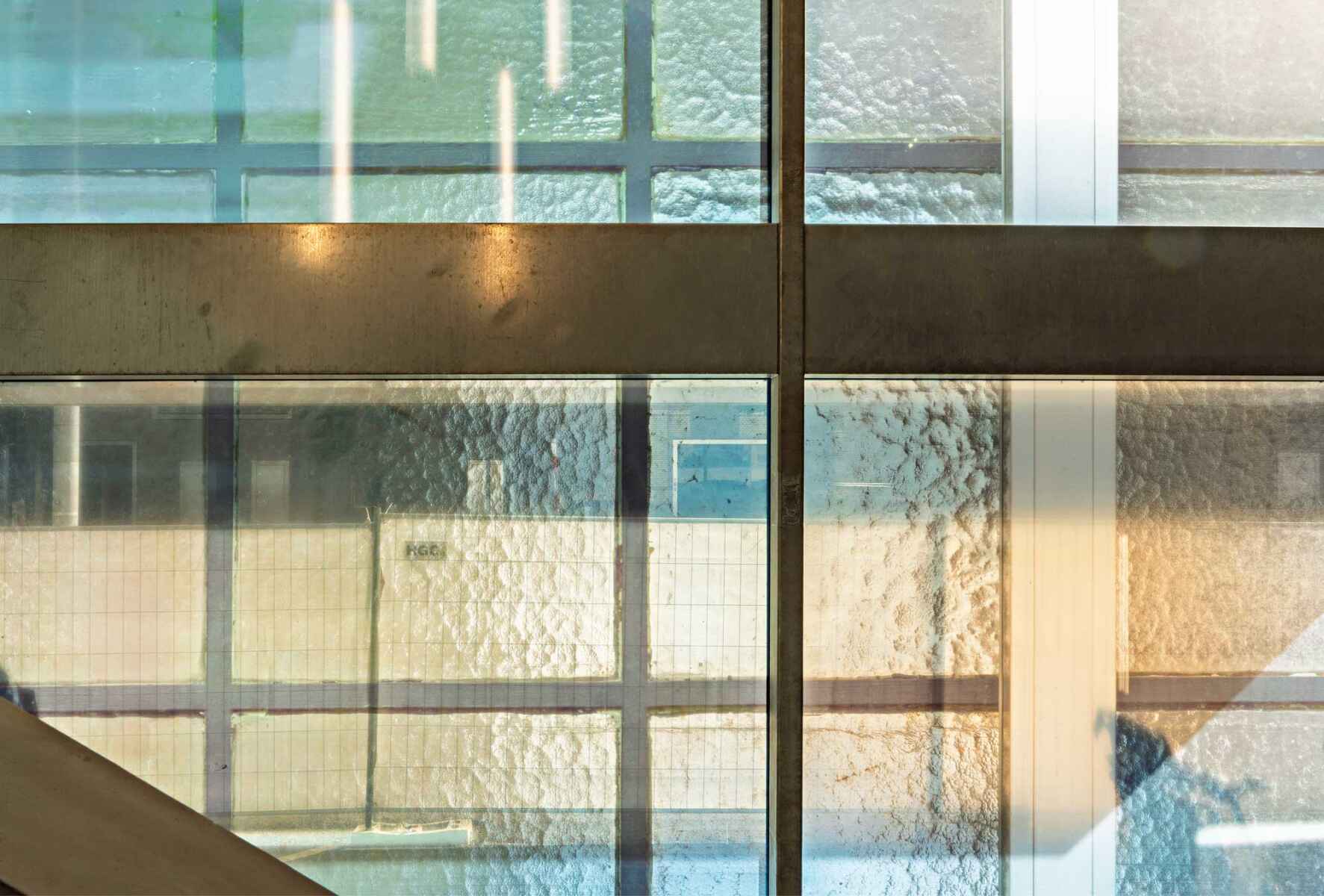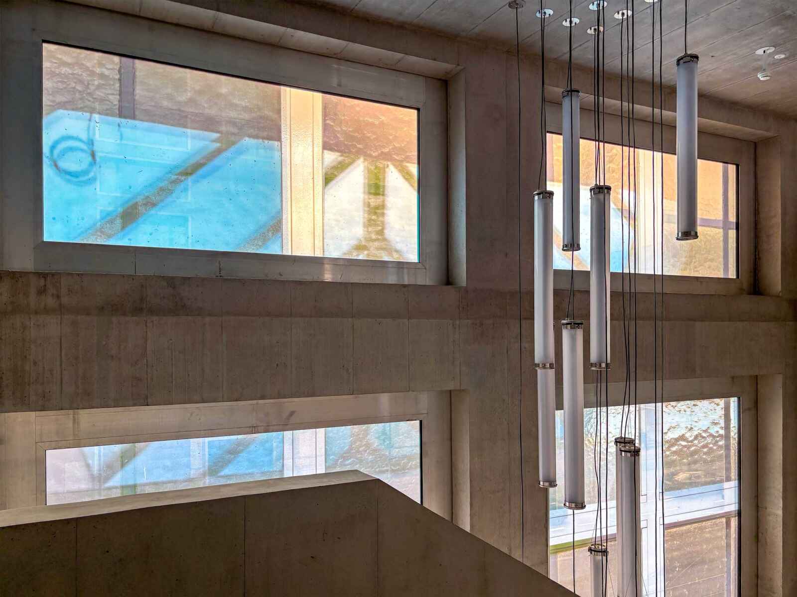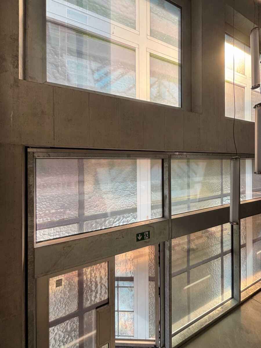 Auf den acht Fensterelementen spiegelt sich durchgehend die Projektion eines Oberlichts in einem Fenster des alten Tramdepots. Mit dem Bild wird aus der Distanz der Haupteingang des Gebäudes hervorgehoben, durchbricht optisch die klar strukturierte Fassade und tritt gleichzeitig mit ihr in einen Dialog. Auf den Wänden des Innenraums bilden die farbigen Schattenwürfe einen atmosphärischen Kontrast zur schlichten Betonarchitektur.