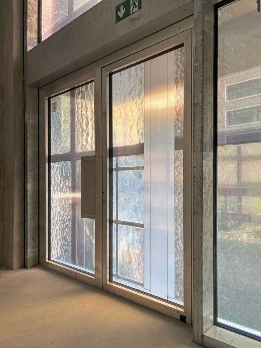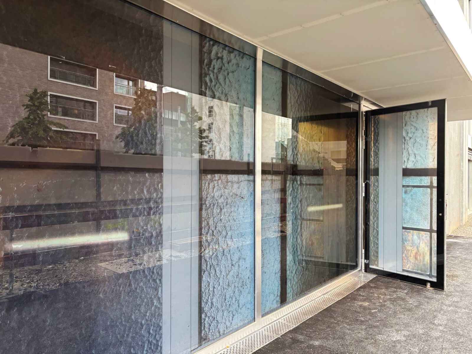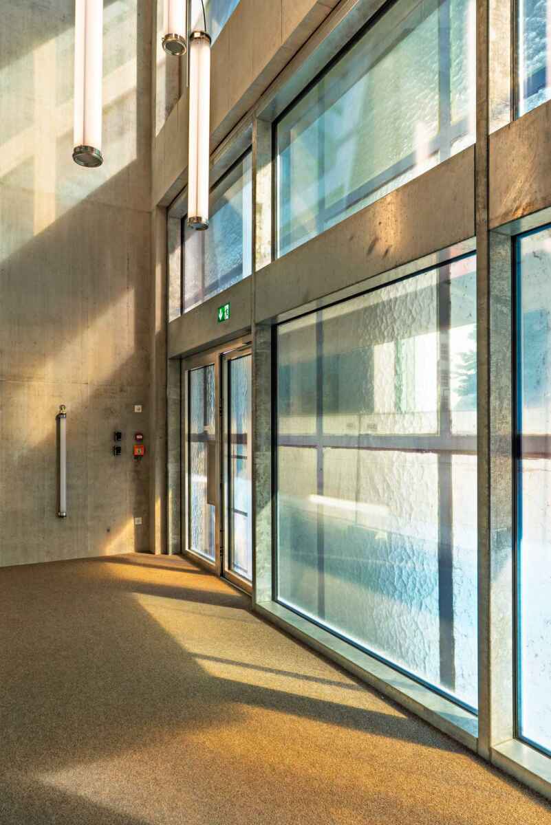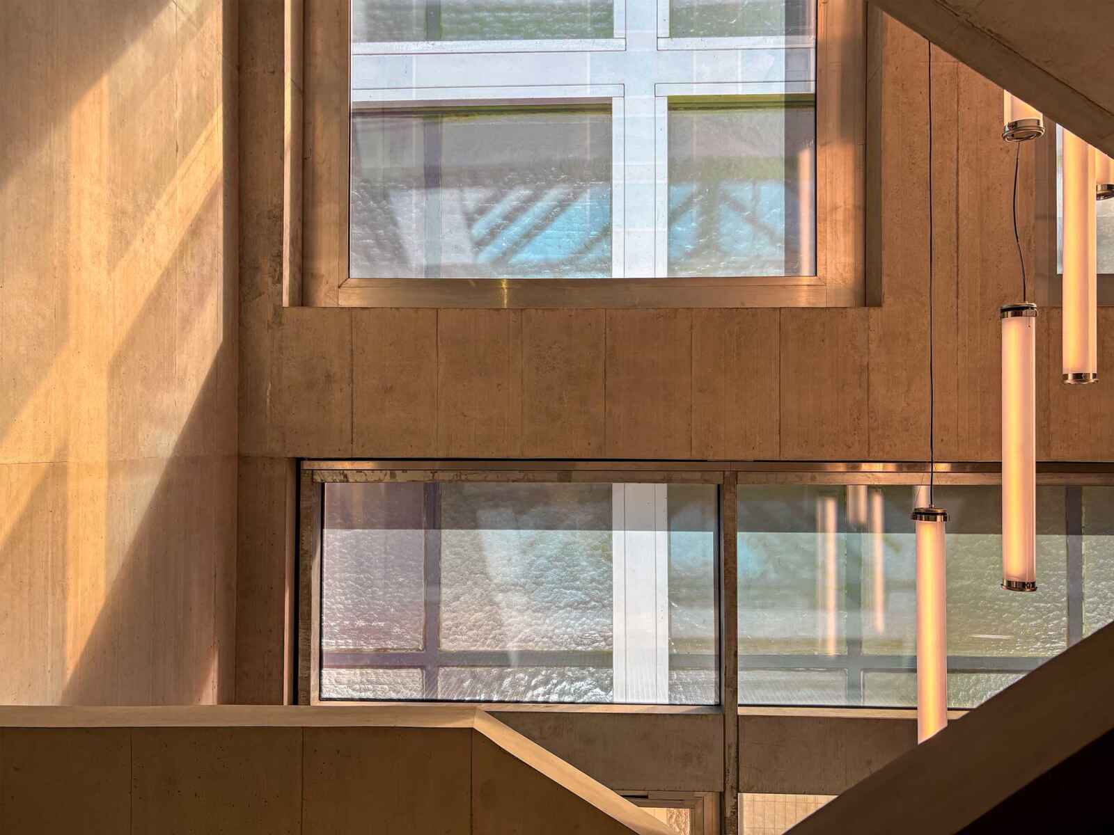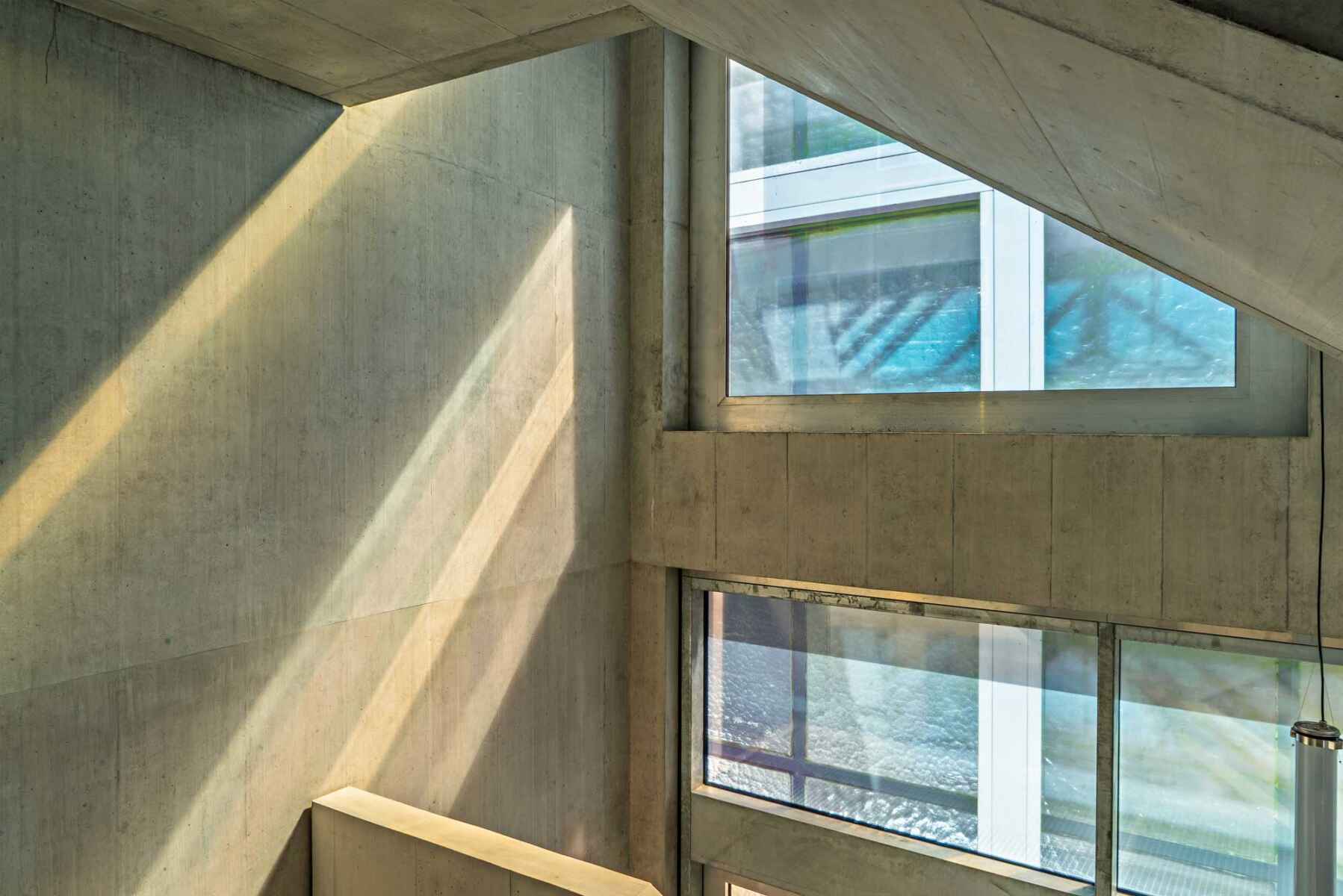 Auf den acht Fensterelementen spiegelt sich durchgehend die Projektion eines Oberlichts in einem Fenster des alten Tramdepots. Mit dem Bild wird aus der Distanz der Haupteingang des Gebäudes hervorgehoben, durchbricht optisch die klar strukturierte Fassade und tritt gleichzeitig mit ihr in einen Dialog. Auf den Wänden des Innenraums bilden die farbigen Schattenwürfe einen atmosphärischen Kontrast zur schlichten Betonarchitektur.
