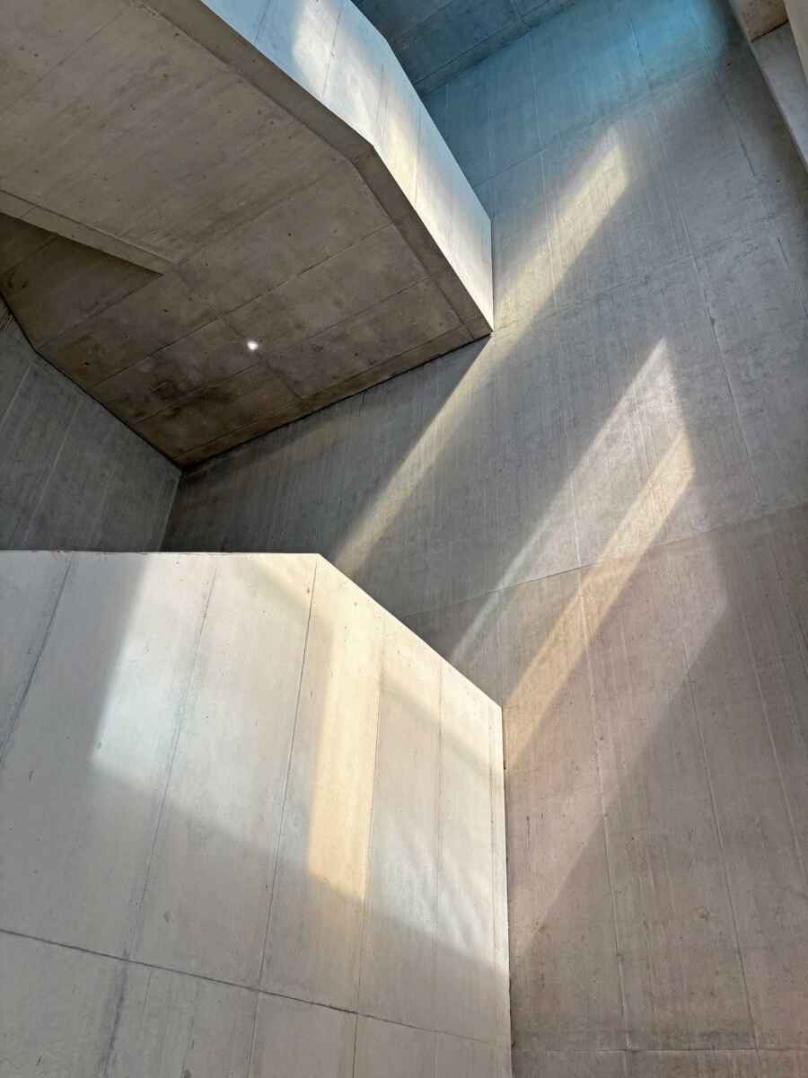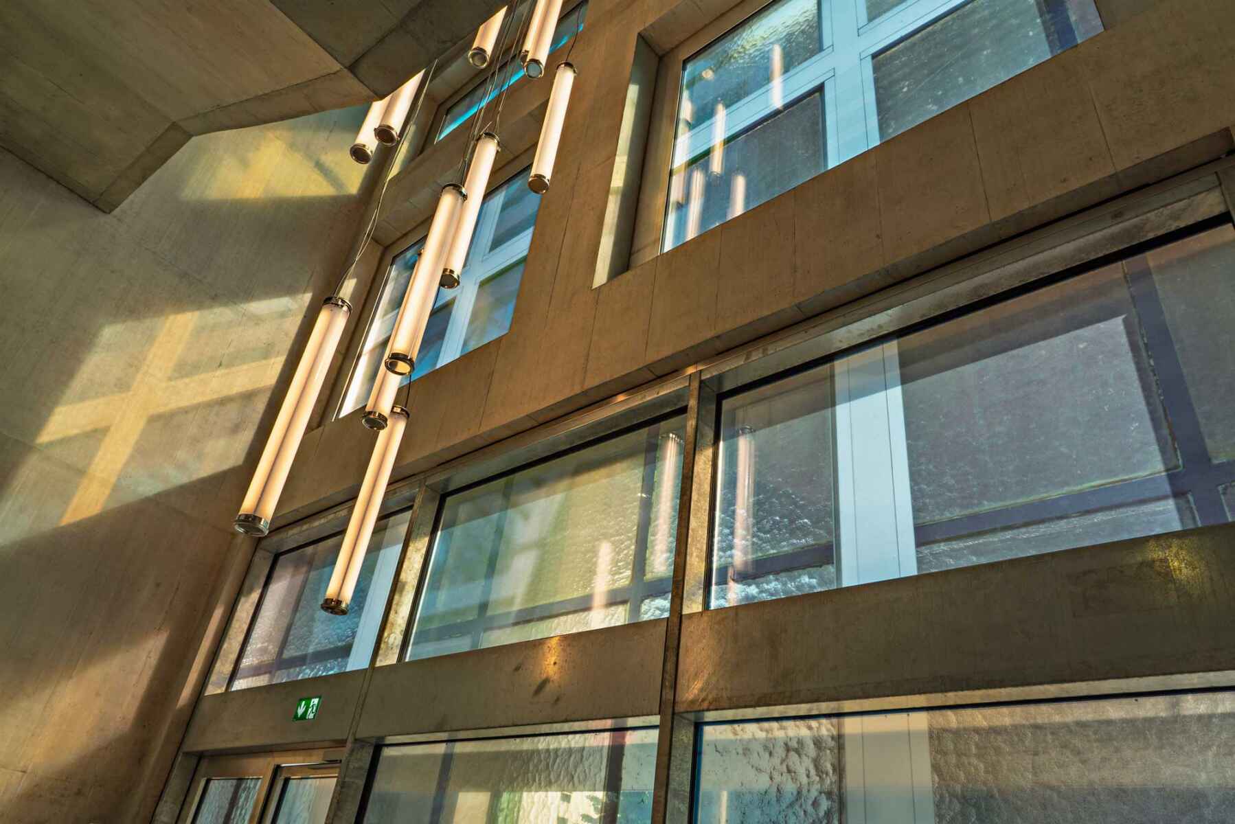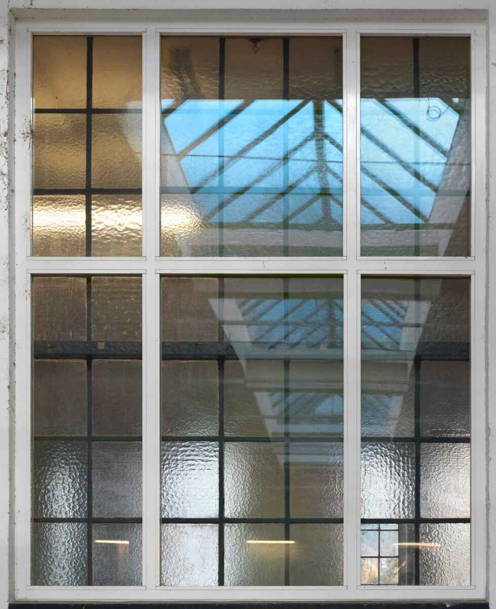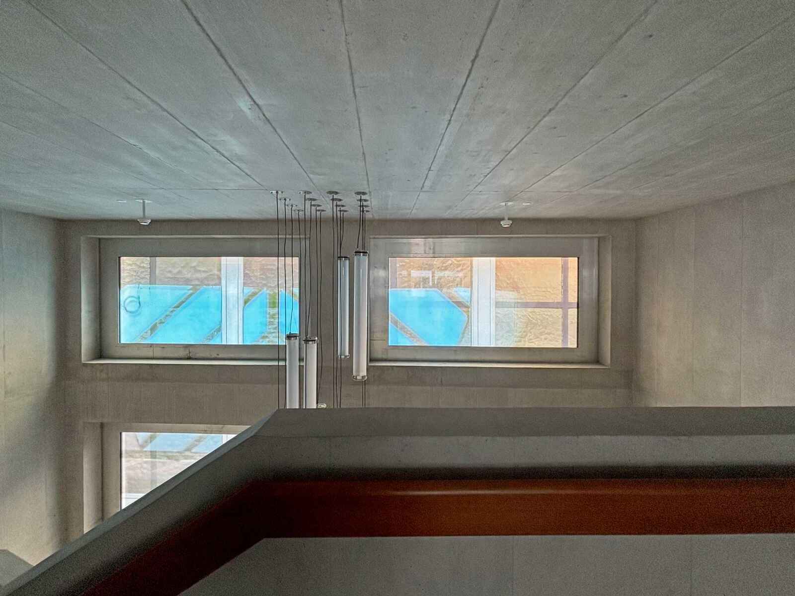 Auf den acht Fensterelementen spiegelt sich durchgehend die Projektion eines Oberlichts in einem Fenster des alten Tramdepots. Mit dem Bild wird aus der Distanz der Haupteingang des Gebäudes hervorgehoben, durchbricht optisch die klar strukturierte Fassade und tritt gleichzeitig mit ihr in einen Dialog. Auf den Wänden des Innenraums bilden die farbigen Schattenwürfe einen atmosphärischen Kontrast zur schlichten Betonarchitektur.