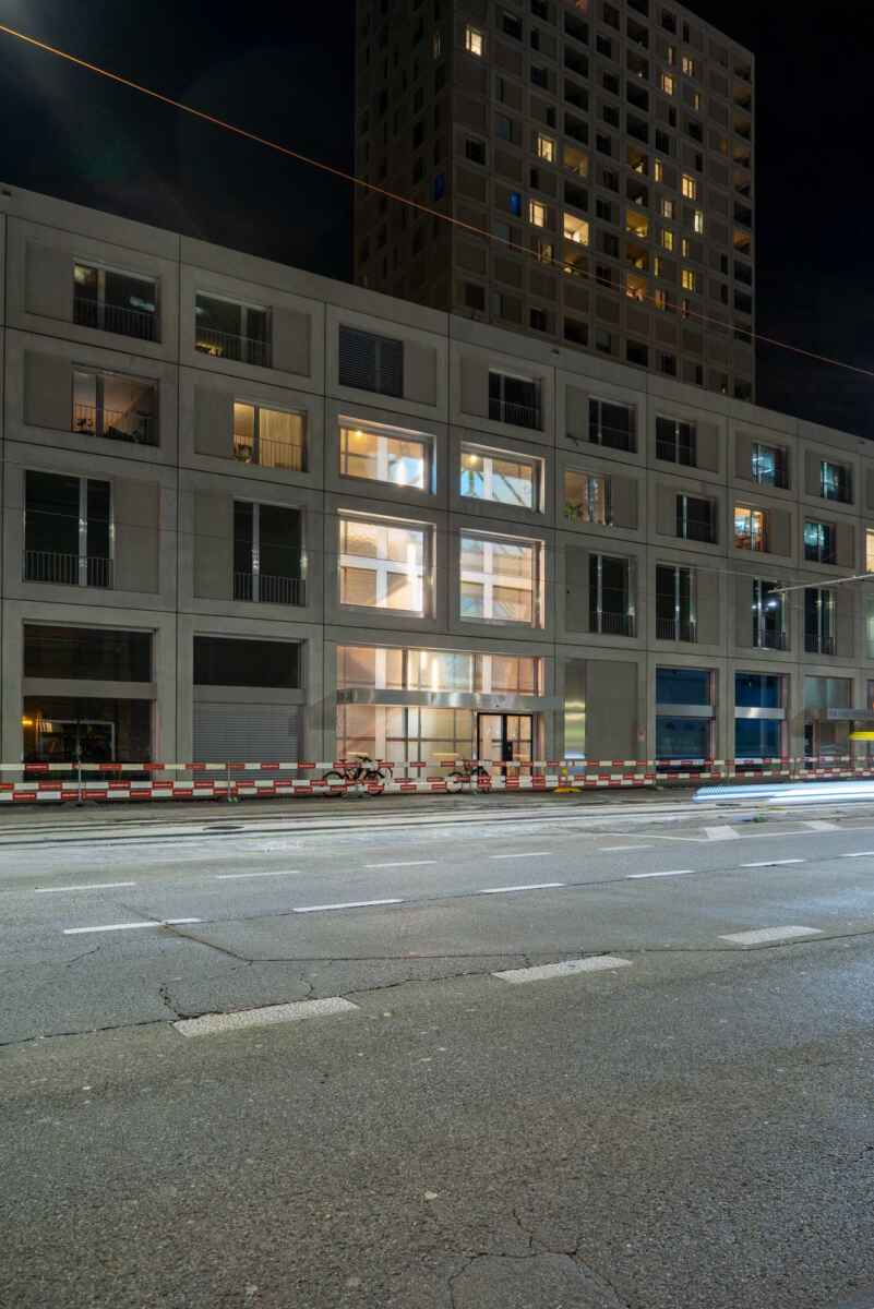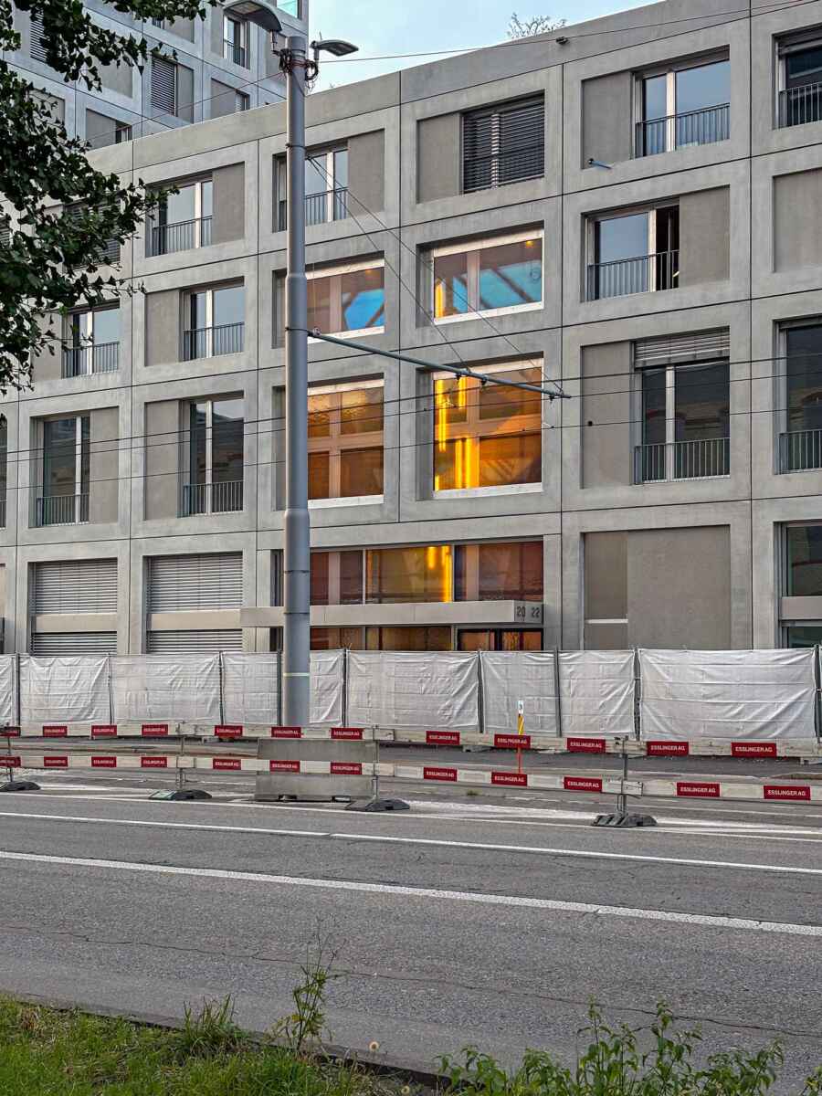 Die Arbeit stellt einen sehr direkten Bezug zur historischen und gegenwärtigen Funktion des Gebäudes als Tramdepot her. Die grossformatige Fotografie auf der Fassade des Treppenhauses, das auch nachts beleuchtet ist, lenkt die Aufmerksamkeit der Passanten in zugleich diskreter und effizienter Weise auf diesen zentralen Zugangsbereich zum ganzen Neubau. Das Bild auf den Fassadenfenstern produziert im Treppenhaus ein interessantes Lichtspiel, das je nach Tageslicht und Witterung ganz anders aussehen kann und den viel begangenen Innenraum zu einem Ort macht, der ganz unterschiedliche Stimmungen vermittelt. «Rear Window» schmiegt sich subtil und diskret in die Architektur ein, gestaltet den Raum zurückhaltend und doch deutlich fühlbar mit und verzahnt den zentralen Zugangsweg zu den Wohntürmen mit der Geschichte und einer wichtigen Funktion des Gebäudes.